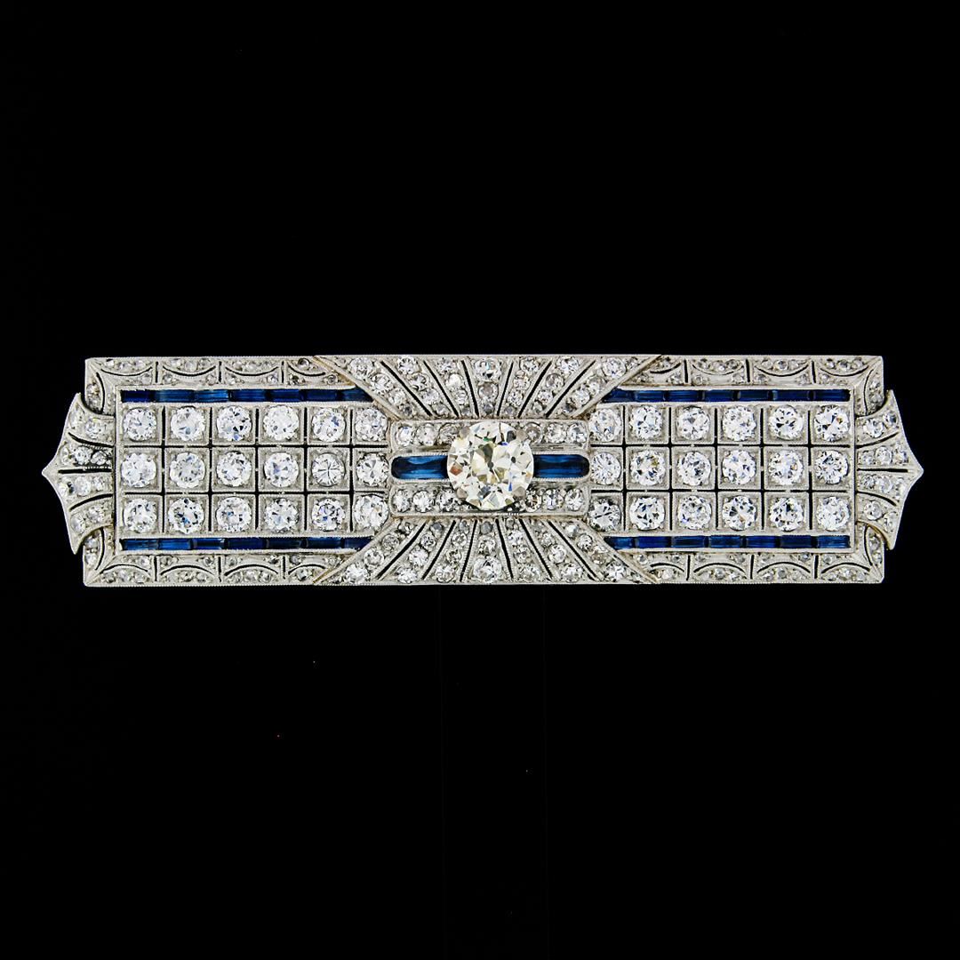 Antique Art Deco Platinum 7.24 ctw Diamond Large Sapphire Filigree Brooch Pin