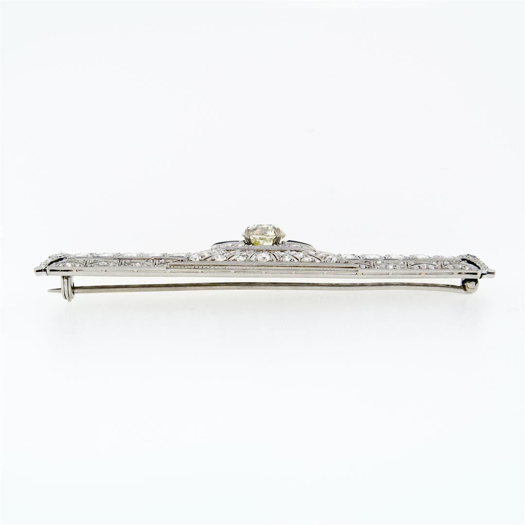An antique. art deco solid platinum bar pin brooch, with 195 old european/rose/single cut natural diamonds (G-L - VS1-SI1; 7.24ctw), and 2 custom bullet cut synthetic sapphires, with straight baguette cut synthetic sapphires. Measures 19.22x73.48mm and weighs a total of 18.09 grams.