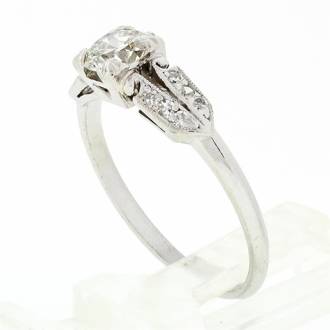 An art deco period solid platinum engagement ring, with 1 old European cut natural diamond (J - VS2; 5.26mm - 0.58ct), and 12 round single cut natural diamonds (H/I - VS1/VS2; 0.18ctw). The ring is size 7.5, weighs a total of 3.44 grams, and measures 5.4mm wide.