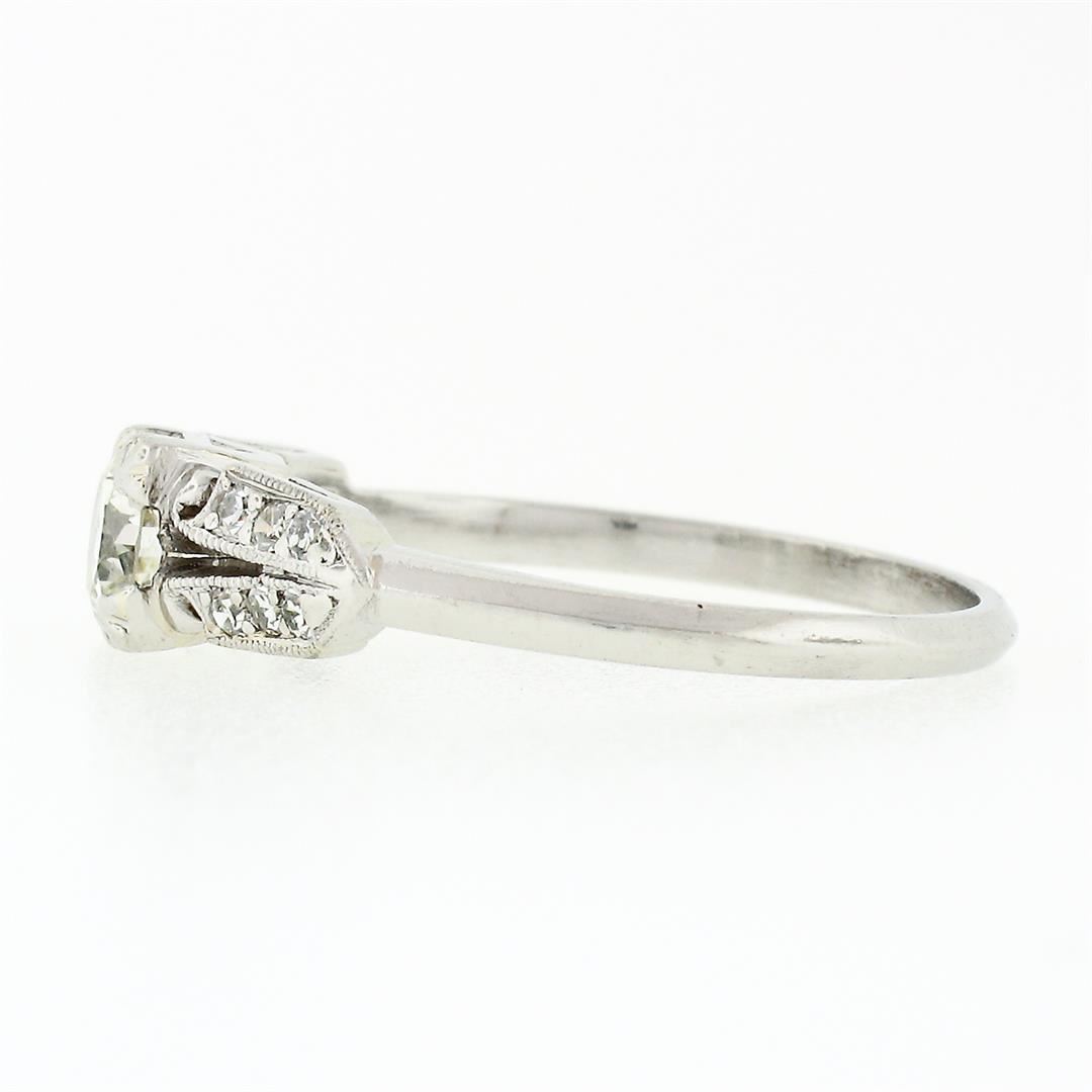 An art deco period solid platinum engagement ring, with 1 old European cut natural diamond (J - VS2; 5.26mm - 0.58ct), and 12 round single cut natural diamonds (H/I - VS1/VS2; 0.18ctw). The ring is size 7.5, weighs a total of 3.44 grams, and measures 5.4mm wide.