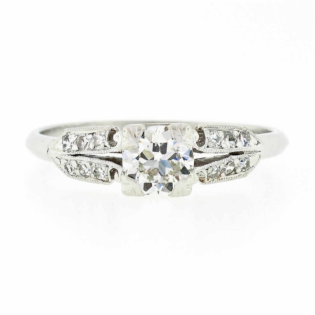 An art deco period solid platinum engagement ring, with 1 old European cut natural diamond (J - VS2; 5.26mm - 0.58ct), and 12 round single cut natural diamonds (H/I - VS1/VS2; 0.18ctw). The ring is size 7.5, weighs a total of 3.44 grams, and measures 5.4mm wide.