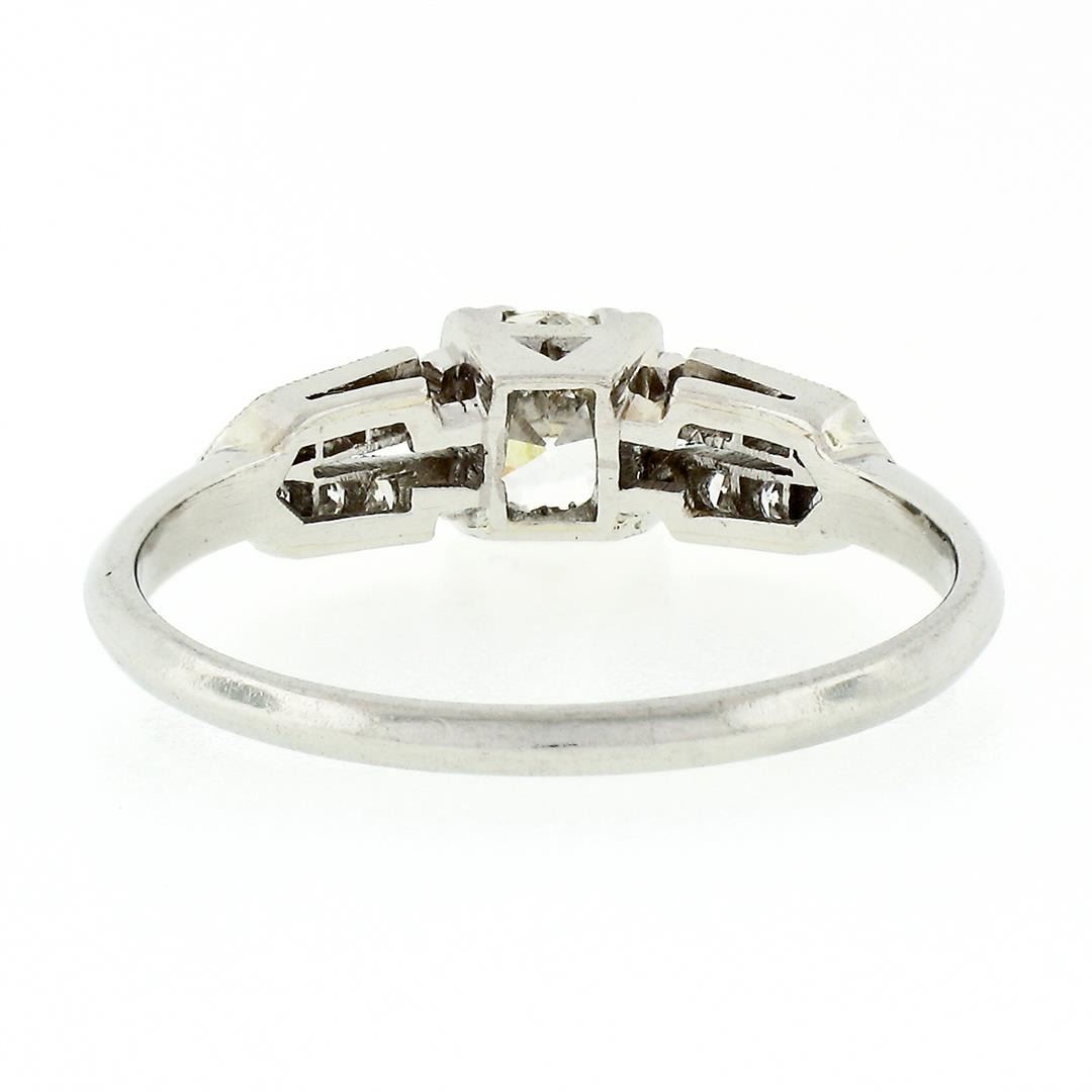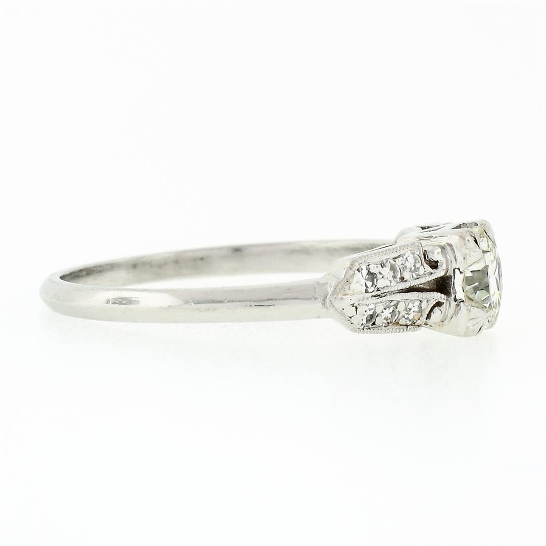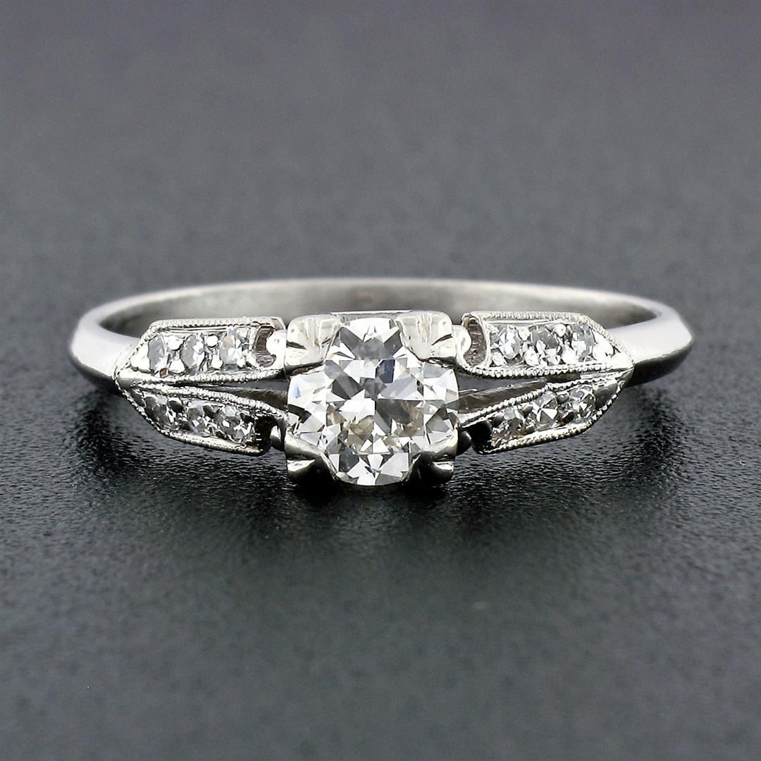 An art deco period solid platinum engagement ring, with 1 old European cut natural diamond (J - VS2; 5.26mm - 0.58ct), and 12 round single cut natural diamonds (H/I - VS1/VS2; 0.18ctw). The ring is size 7.5, weighs a total of 3.44 grams, and measures 5.4mm wide.