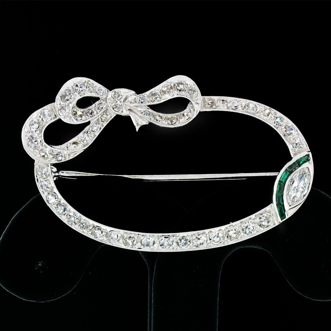 An antique solid platinum wreath pin brooch, with 54 old single & european cut natural diamonds (F-H - VS1-SI1 ; 1.40ctw ), and 1 old marquise cut natural diamond (I - VS2 ; 0.30ct), with 6 french calibre cut synthetic emerald. Measures 25.6x42.35mm and weighs a total of 6.83 grams.