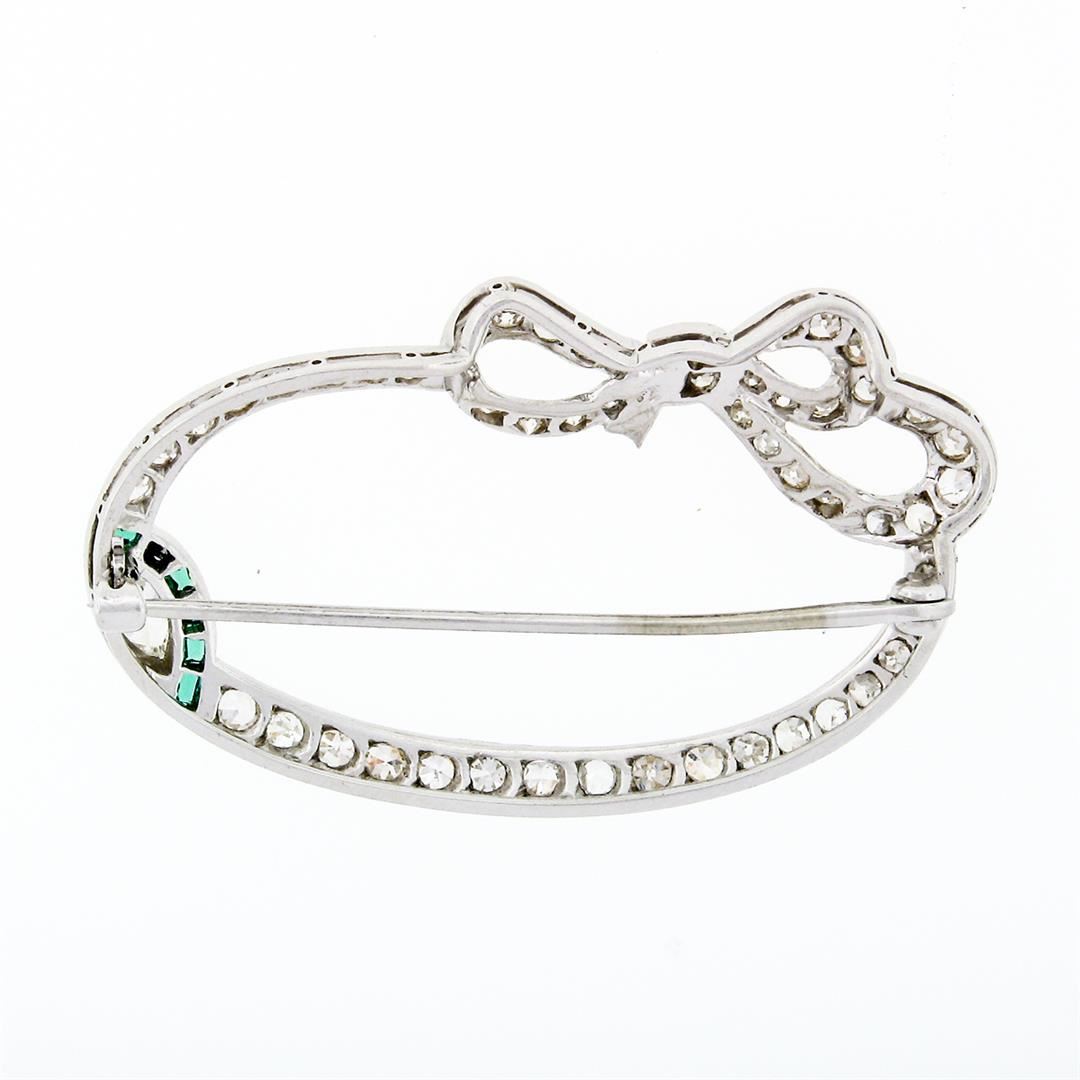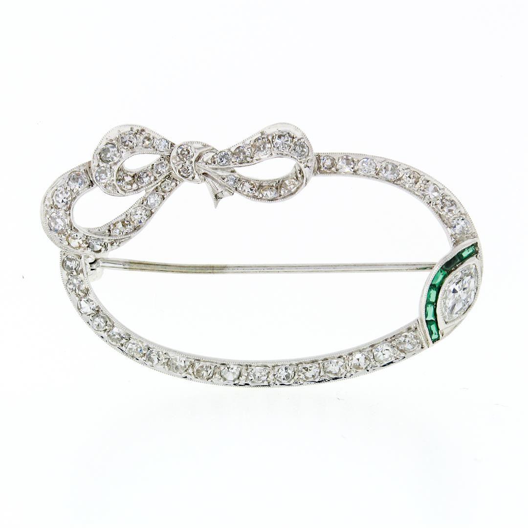 An antique solid platinum wreath pin brooch, with 54 old single & european cut natural diamonds (F-H - VS1-SI1 ; 1.40ctw ), and 1 old marquise cut natural diamond (I - VS2 ; 0.30ct), with 6 french calibre cut synthetic emerald. Measures 25.6x42.35mm and weighs a total of 6.83 grams.