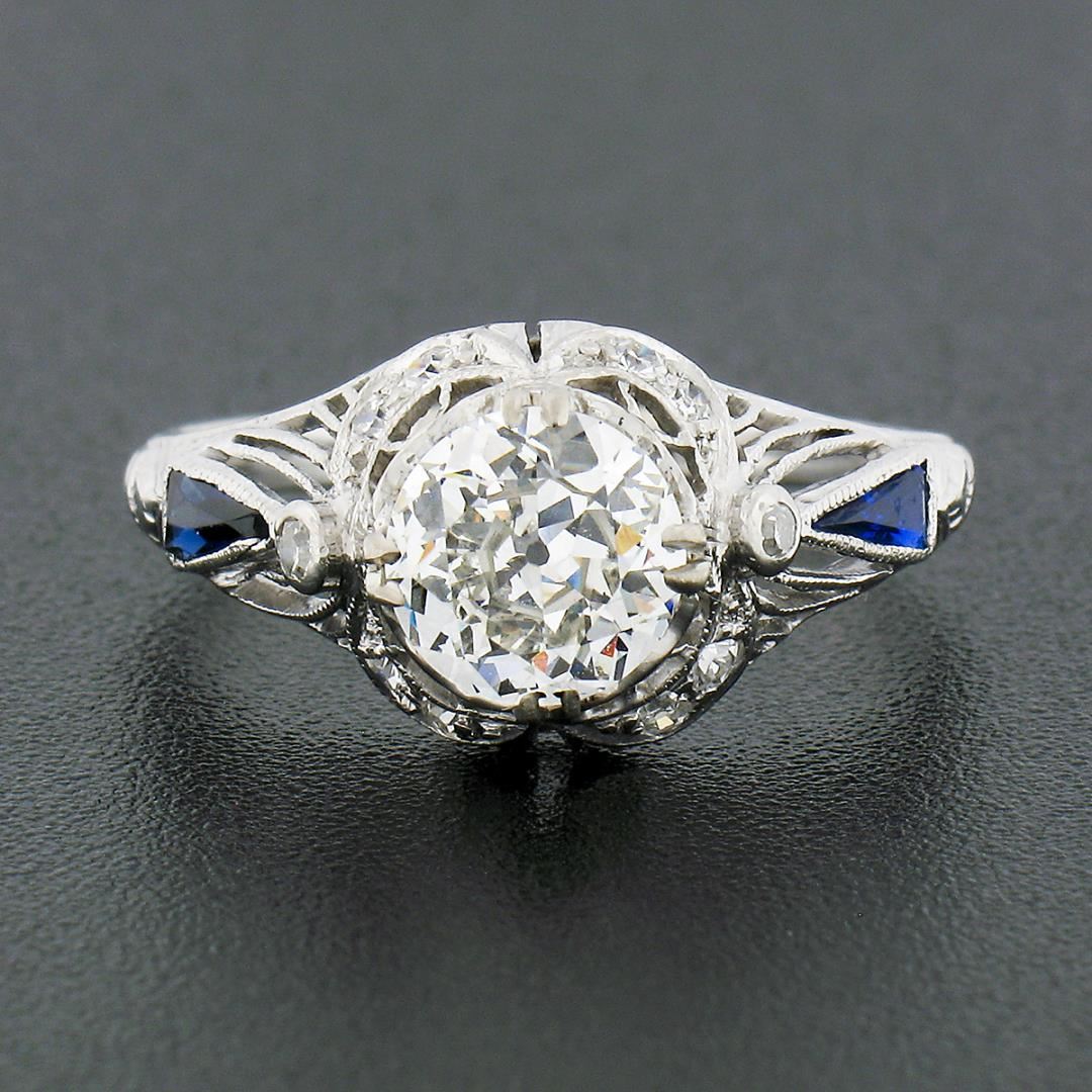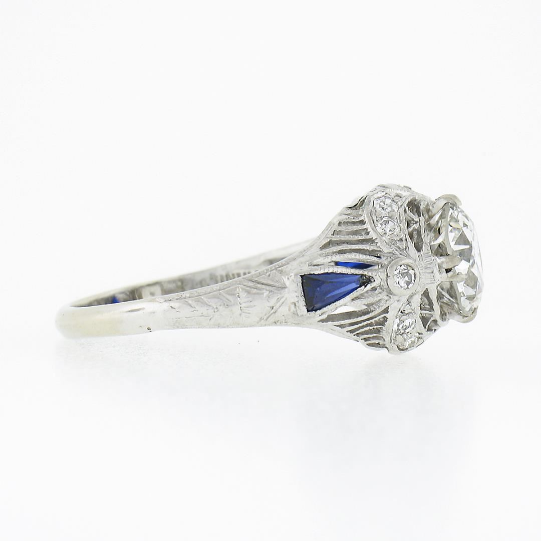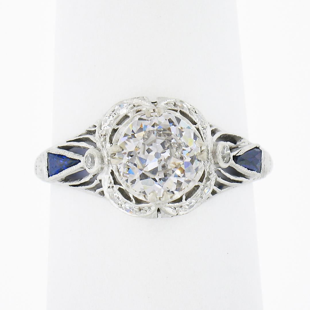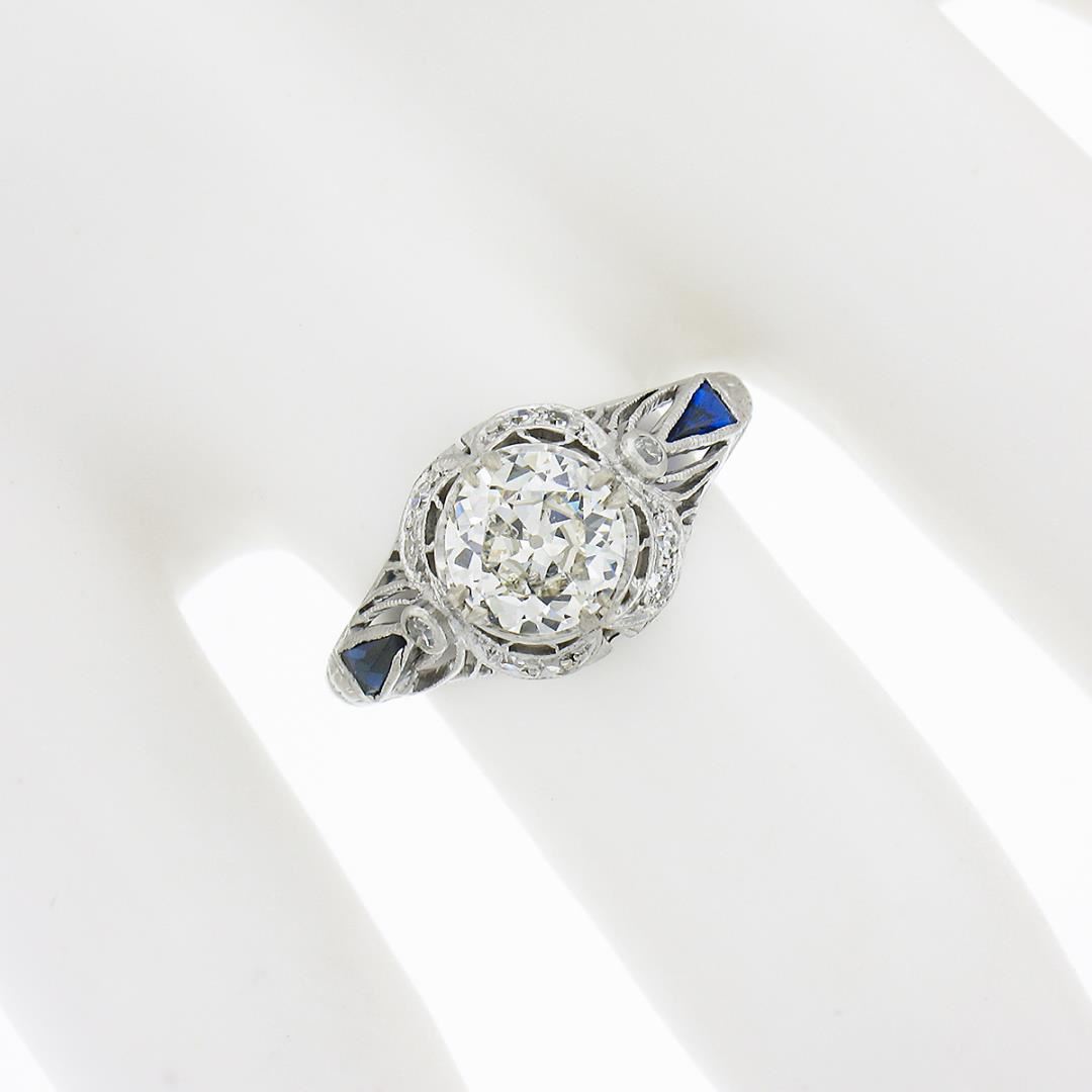 An antique solid platinum engagement ring, with 1 GIA graded old European cut natural diamond (J - VS2 ; 1.03ct), and 10 old single cut natural diamonds (H/I - VS1/VS2 ; 0.18ctw), with 2 triangle cut synthetic sapphires (4.3x2.1mm & 4.3x1.9mm). The ring is size 6.0, weighs a total of 2.87 grams, and measures 9.70mm wide. Comes with all original relevant certifications.