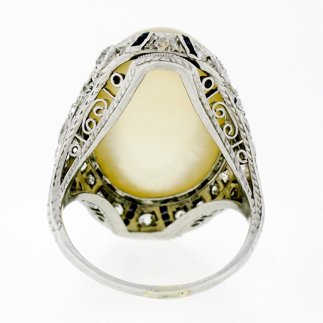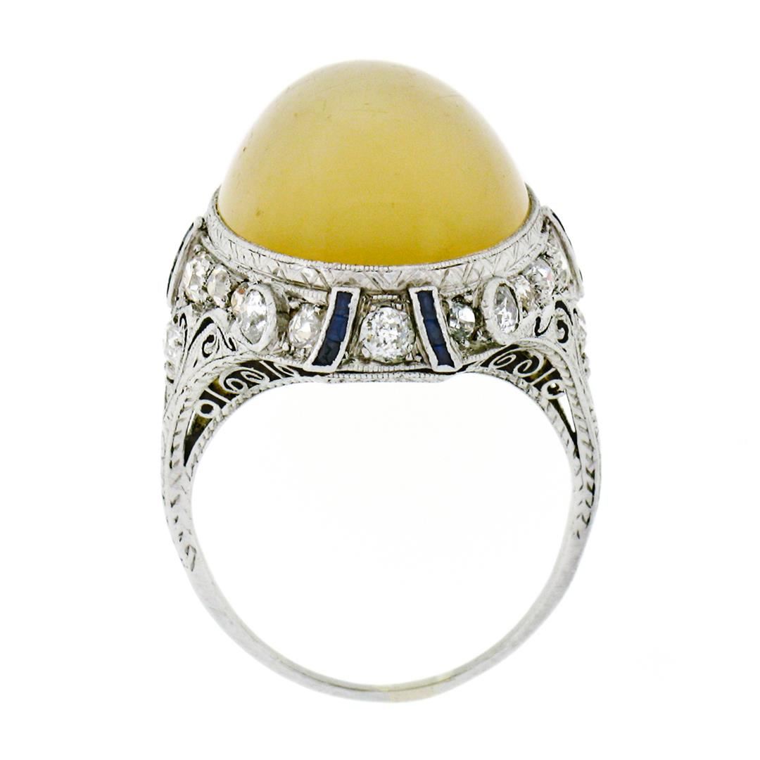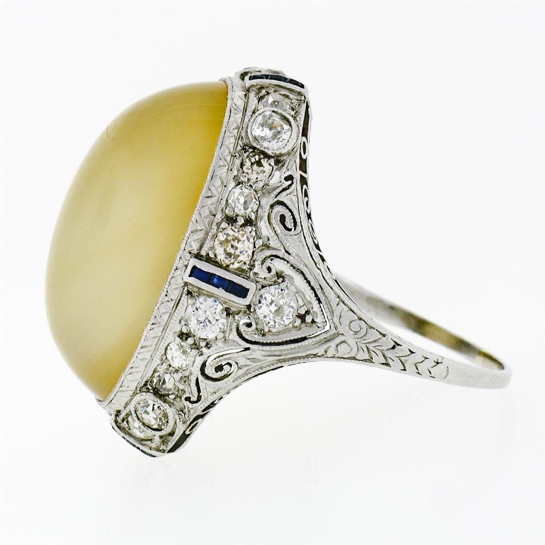 An antique solid platinum cocktail ring, with 1 oval cabochon cut natural moonstone (22.0x15.0mm ), and 24 old european cut natural diamonds (G/I - VS1/SI2 ;1.40ctw), with 18 baguette calibré Cut natural sapphires (0.36ctw). The ring is size 7.75, weighs a total of 11.25 grams, and measures 25.68mm wide.