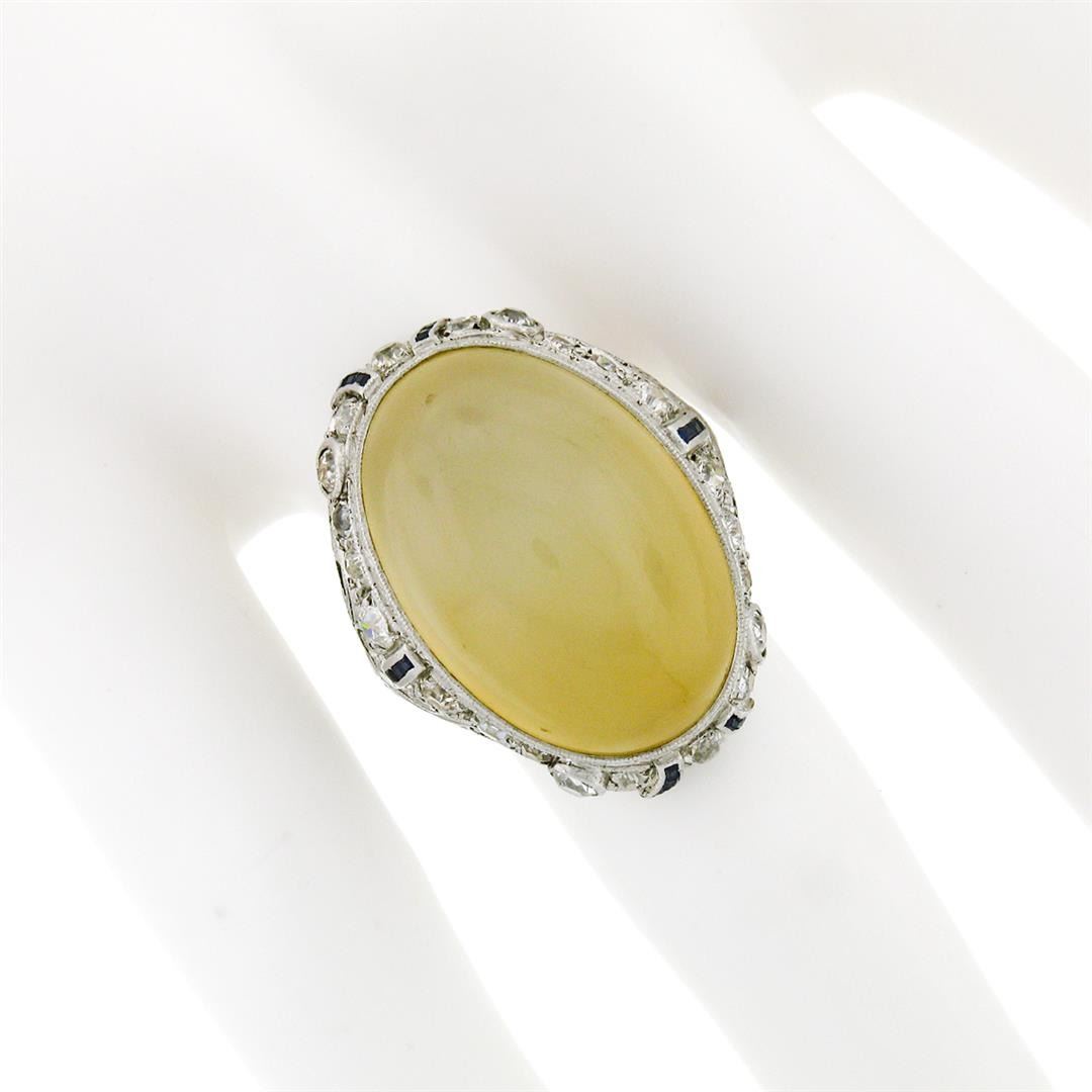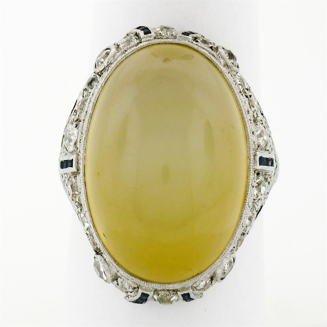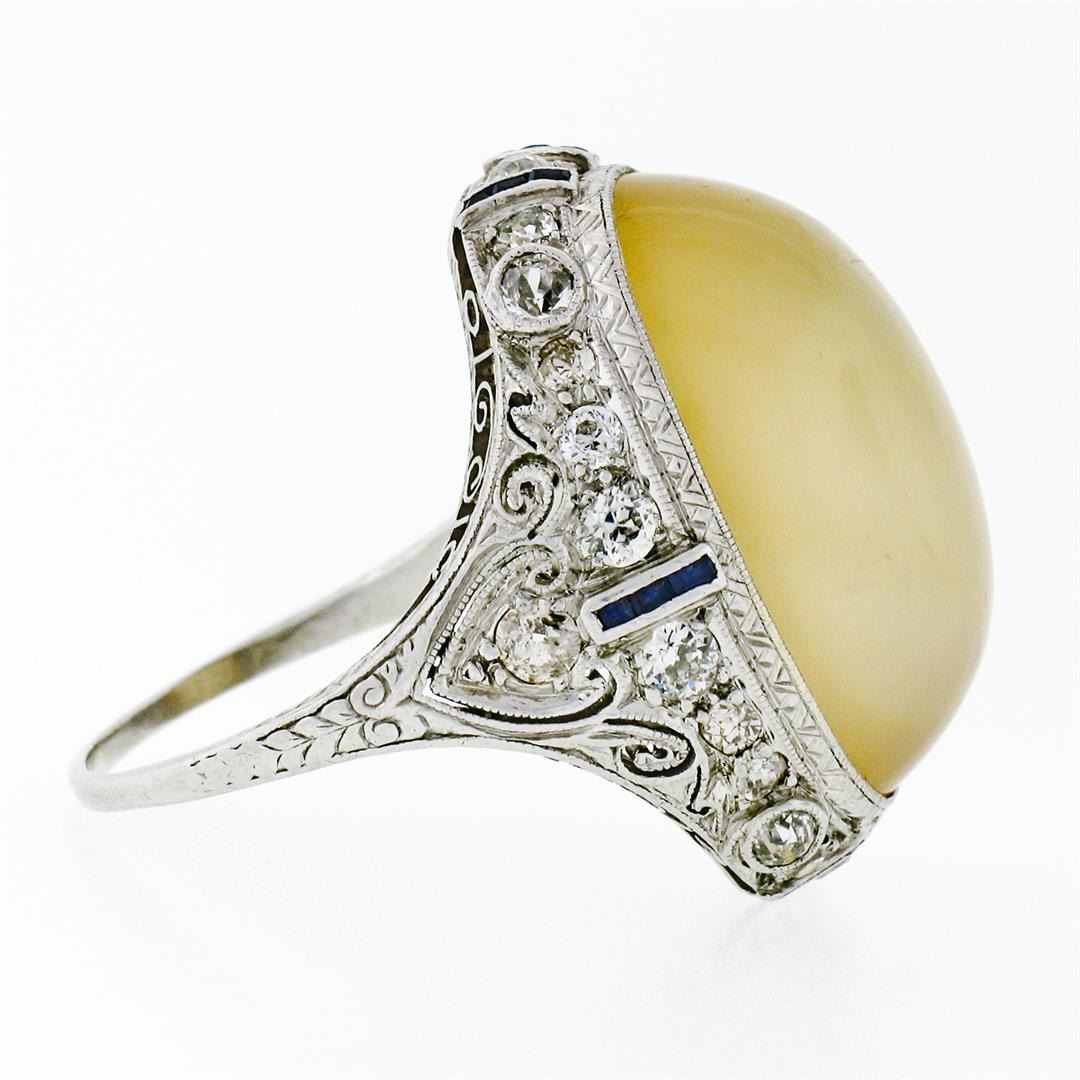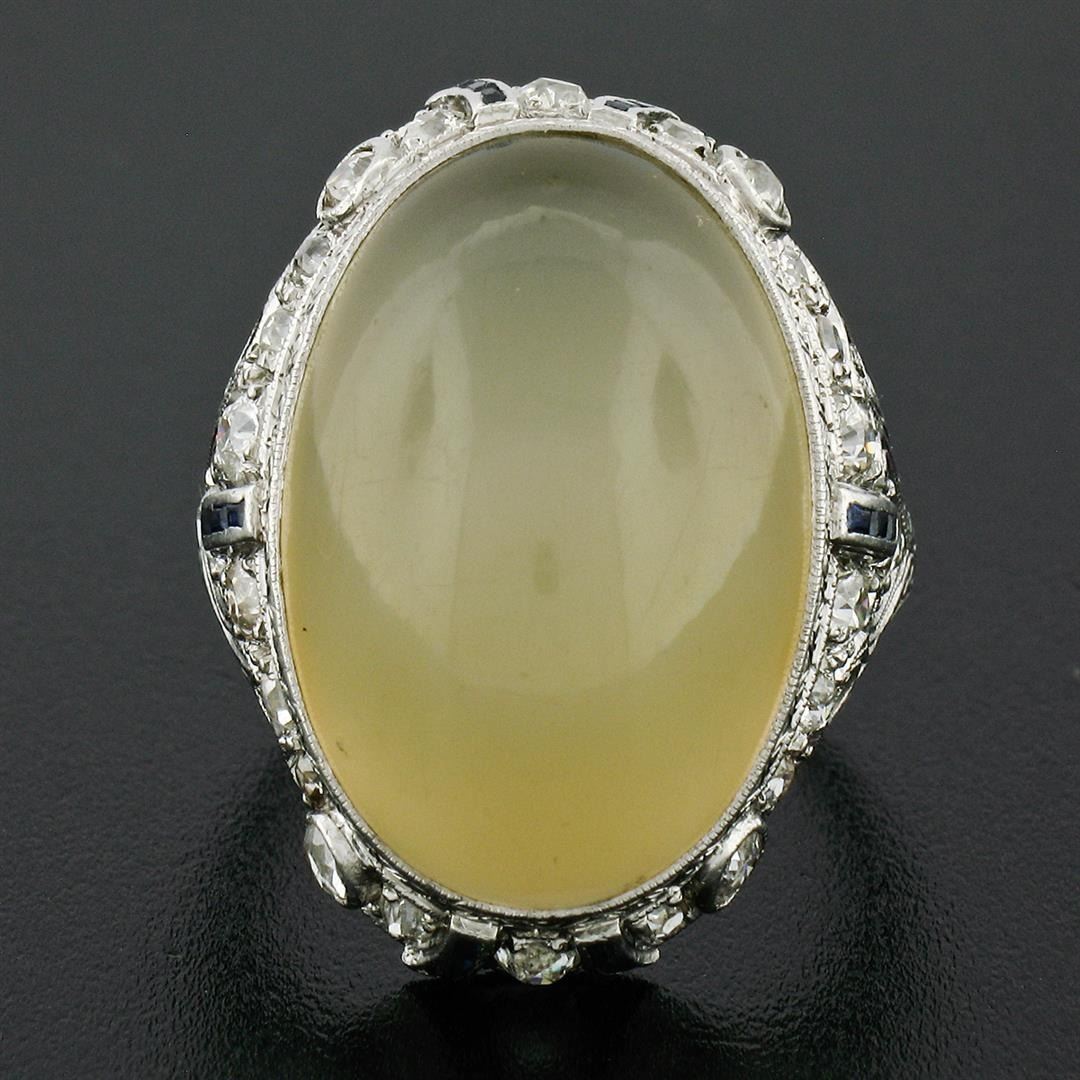 An antique solid platinum cocktail ring, with 1 oval cabochon cut natural moonstone (22.0x15.0mm ), and 24 old european cut natural diamonds (G/I - VS1/SI2 ;1.40ctw), with 18 baguette calibré Cut natural sapphires (0.36ctw). The ring is size 7.75, weighs a total of 11.25 grams, and measures 25.68mm wide.