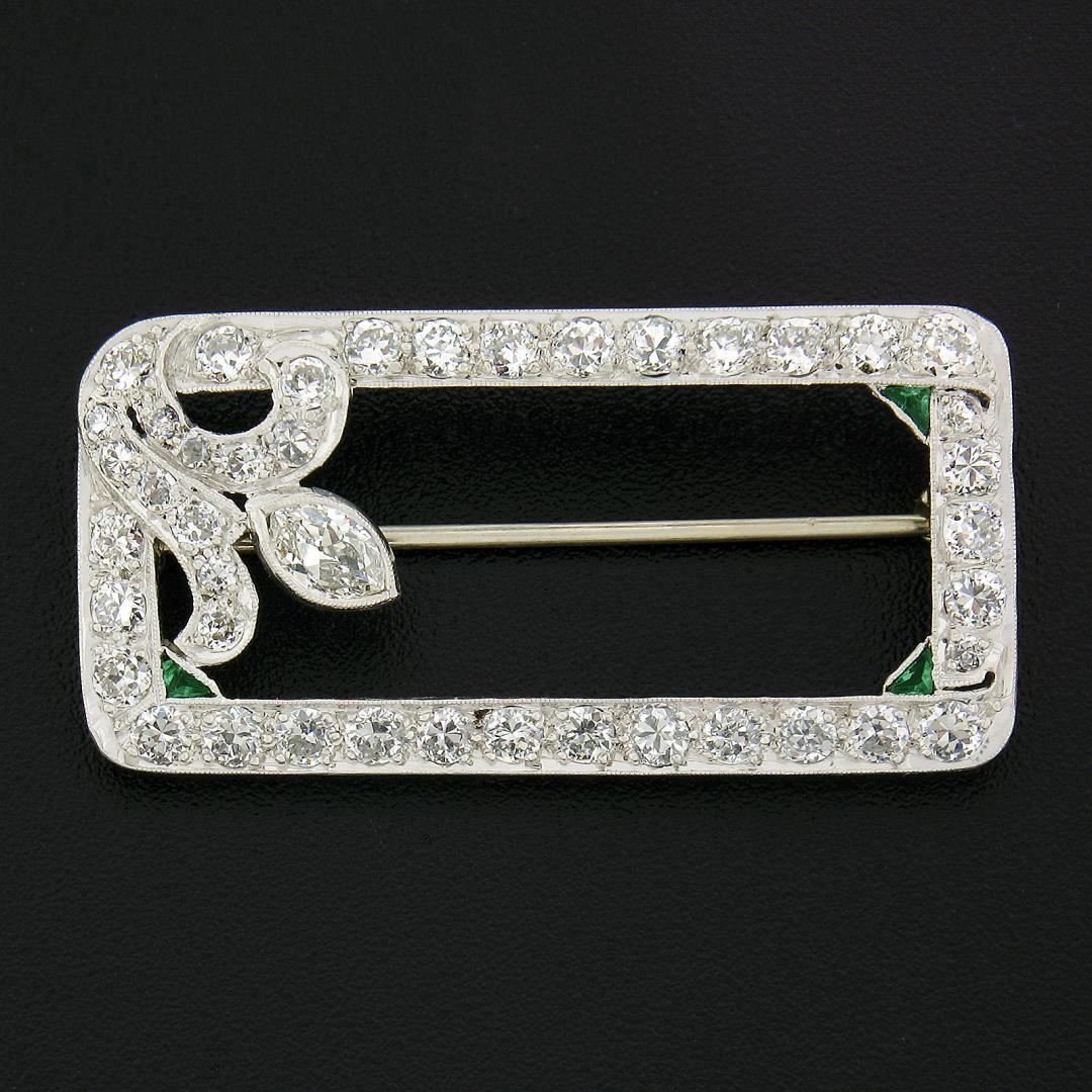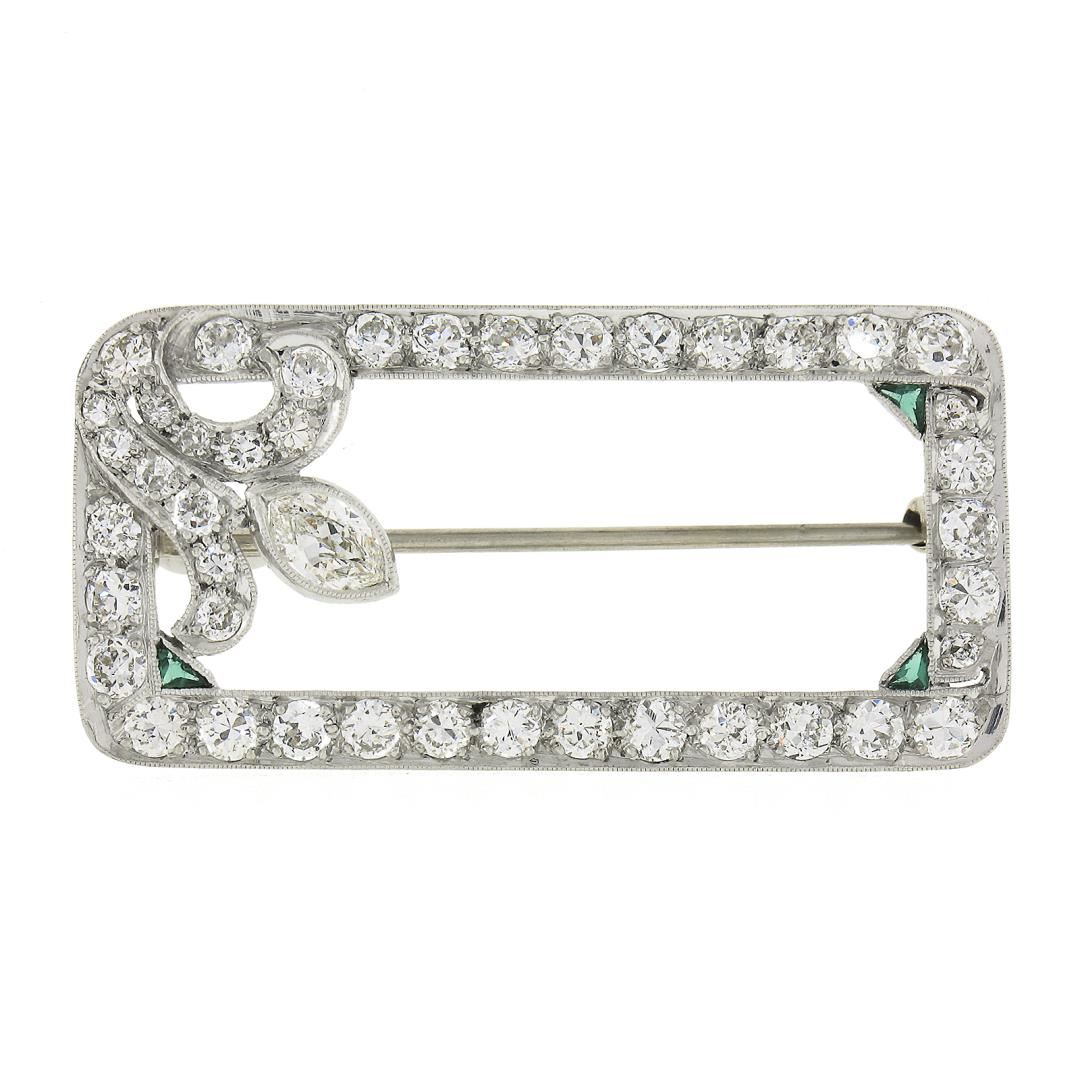 An antique solid platinum brooch, with 42 old european cut & 1 old marquise cut natural diamonds (G/I - VS1-SI2 ; 2.25ctw), and 3 triangular cut synthetic emeralds . Measures 18.5x37.3mm and weighs a total of 5.9 grams.