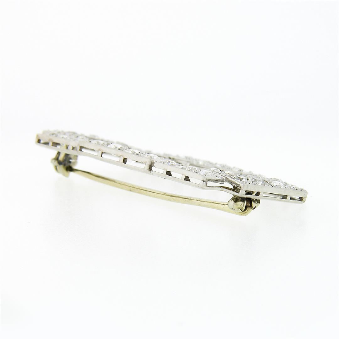 An antique art deco solid platinum open pin brooch, with 38 old european and old mine cut natural diamonds (G/I - VS1/VS2 w/ a few SI1; 3.10ctw). Measures 21.20x41.80mm and weighs a total of 6.86 grams.