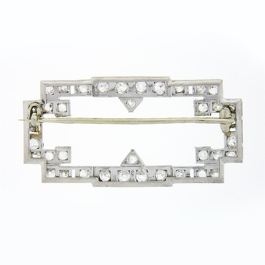 An antique art deco solid platinum open pin brooch, with 38 old european and old mine cut natural diamonds (G/I - VS1/VS2 w/ a few SI1; 3.10ctw). Measures 21.20x41.80mm and weighs a total of 6.86 grams.
