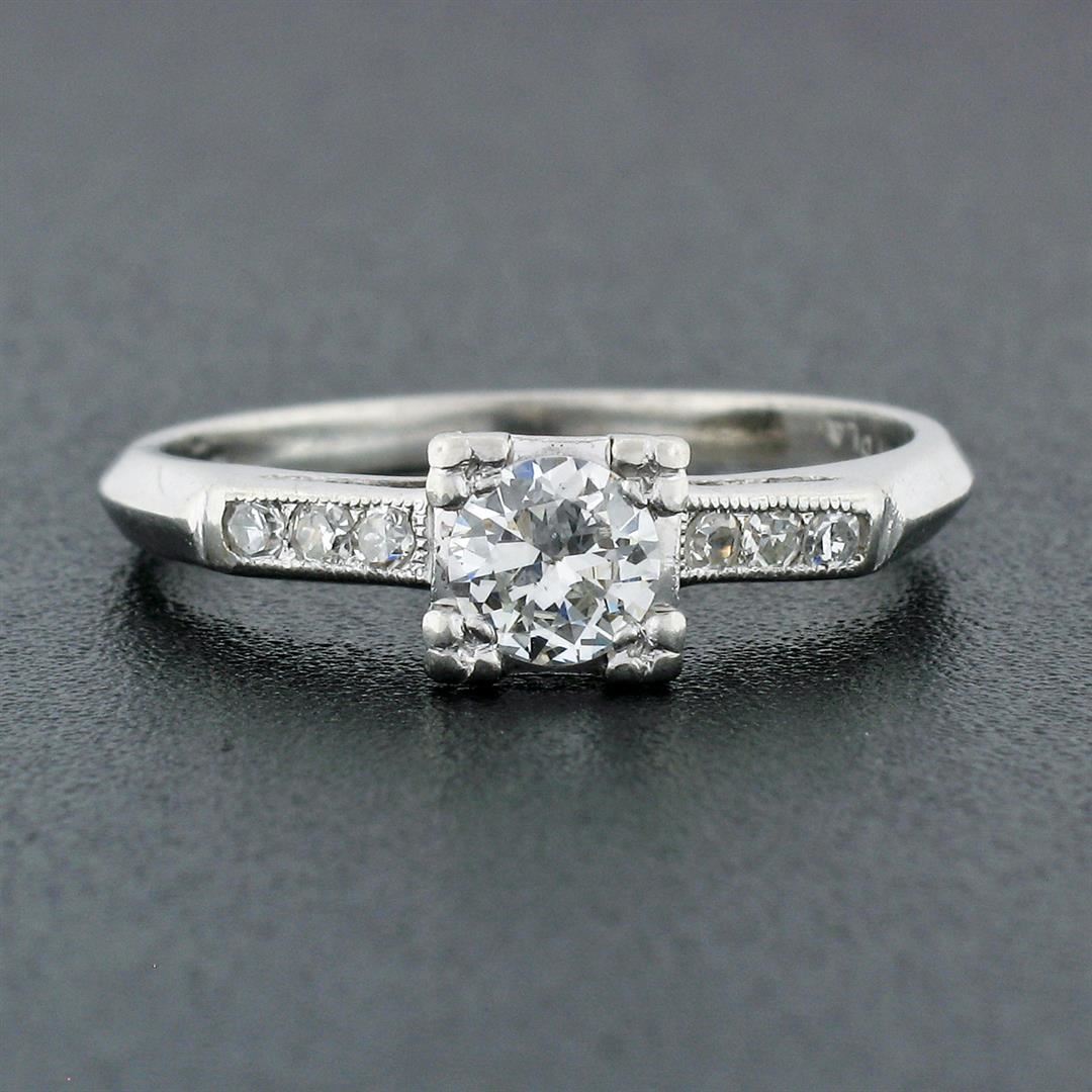 An antique art deco solid platinum engagement ring, with 1 old european cut natural diamond (G - VS2 ; 0.38ct), and 6 round single cut natural diamonds (F - VS1 ; 0.06ctw). The ring is size 6.5, weighs a total of 3.71 grams, and measures 5.4mm wide.