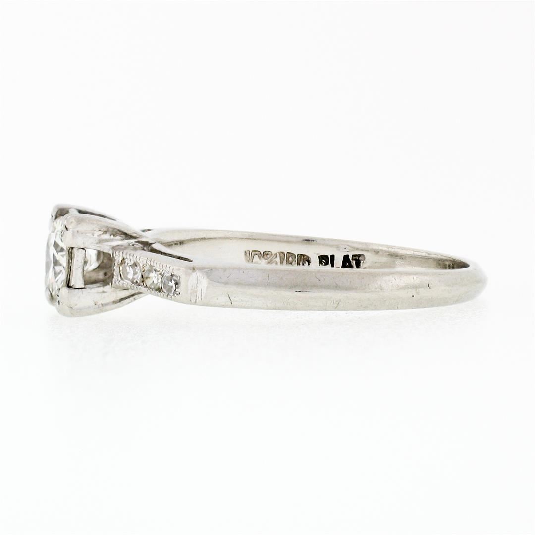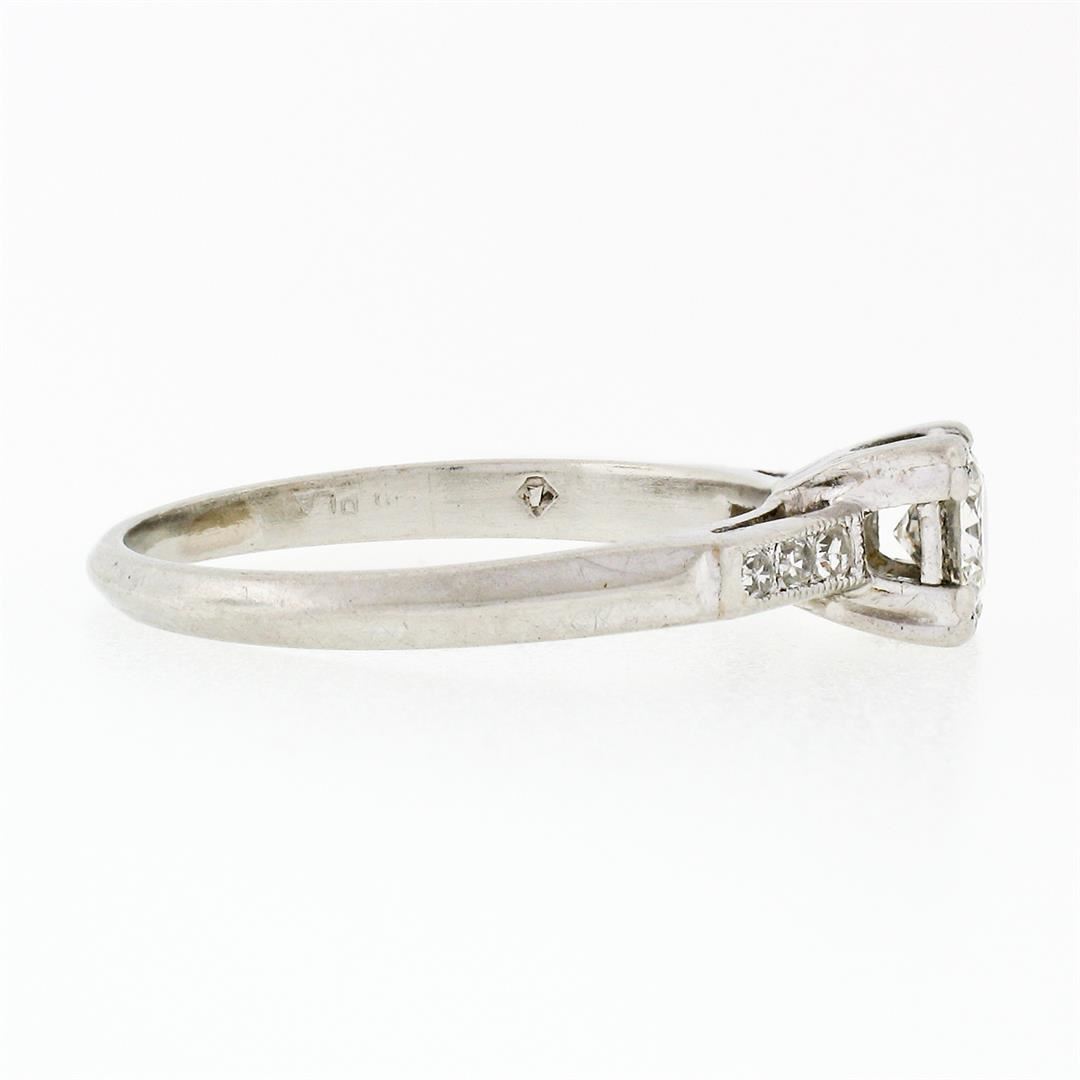 An antique art deco solid platinum engagement ring, with 1 old european cut natural diamond (G - VS2 ; 0.38ct), and 6 round single cut natural diamonds (F - VS1 ; 0.06ctw). The ring is size 6.5, weighs a total of 3.71 grams, and measures 5.4mm wide.