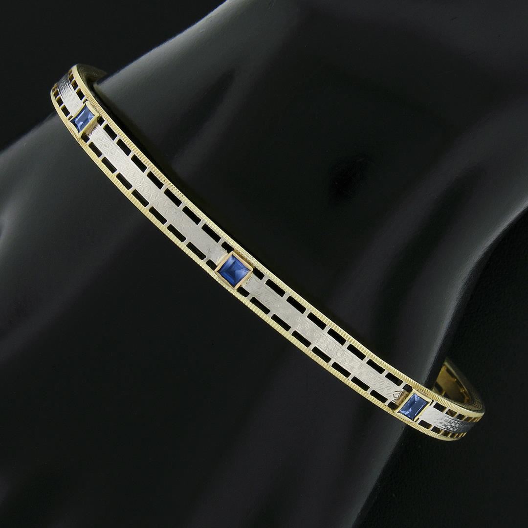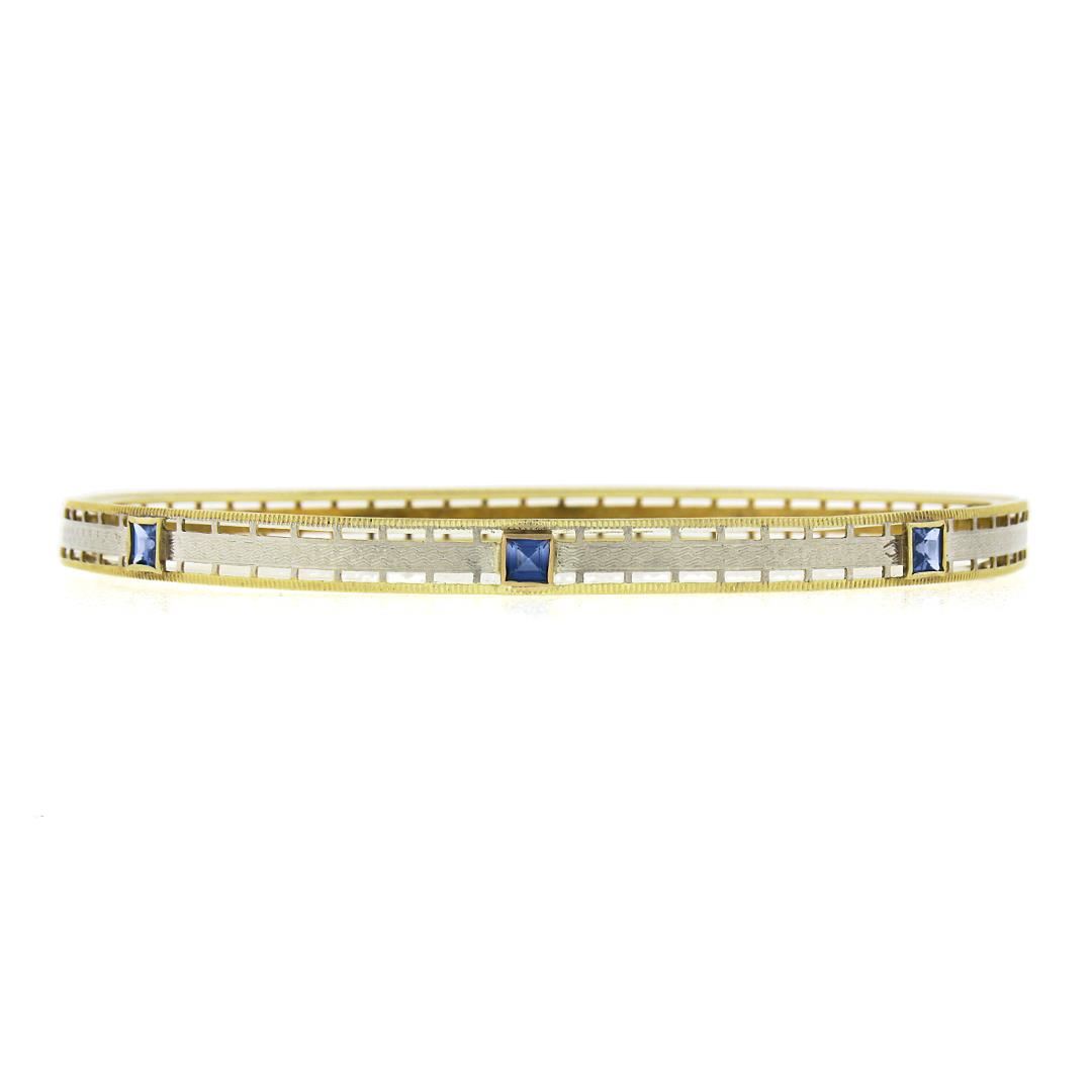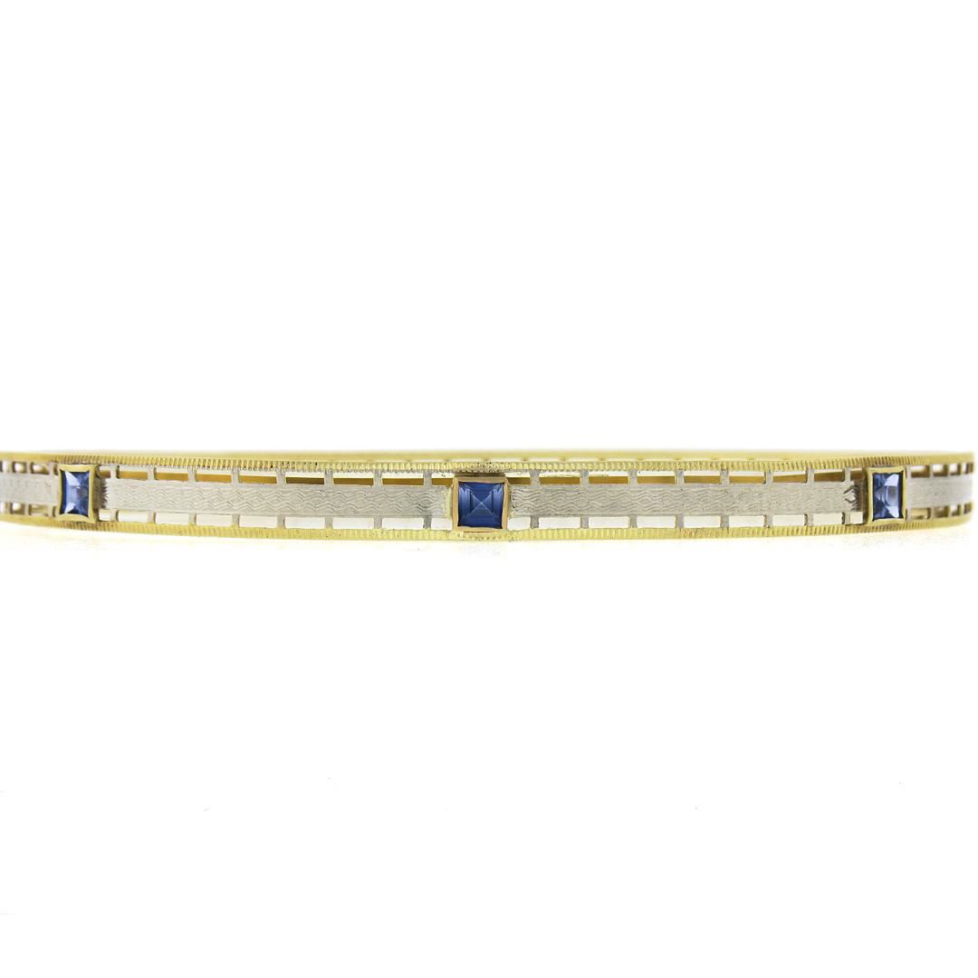 An antique solid 14k yellow and white gold slip on bangle bracelet, with 3 square step cut natural sapphires (2.5mm). It weighs a total of 10.04 grams, measures 5mm wide, and measures 7.5 inches in length.