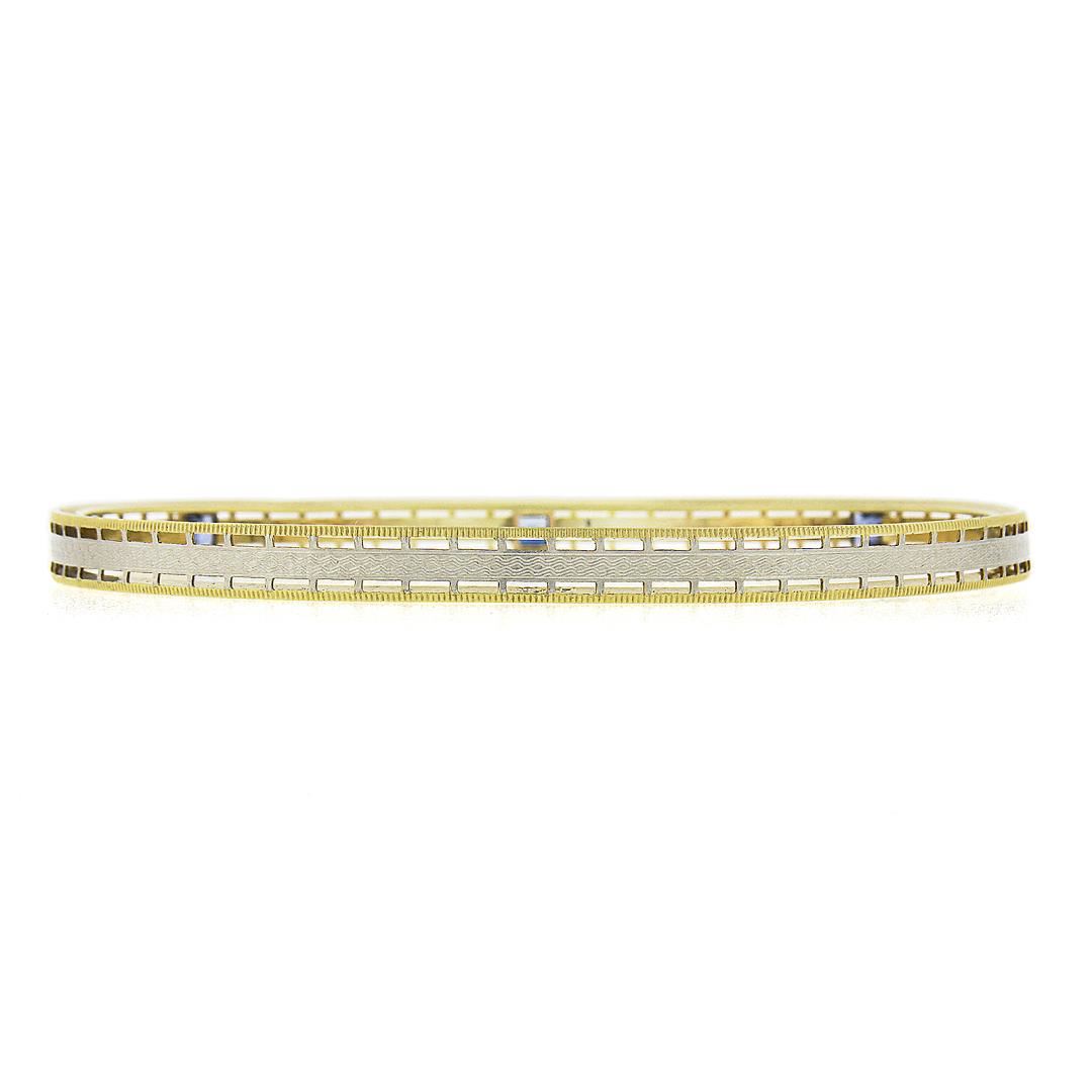 An antique solid 14k yellow and white gold slip on bangle bracelet, with 3 square step cut natural sapphires (2.5mm). It weighs a total of 10.04 grams, measures 5mm wide, and measures 7.5 inches in length.