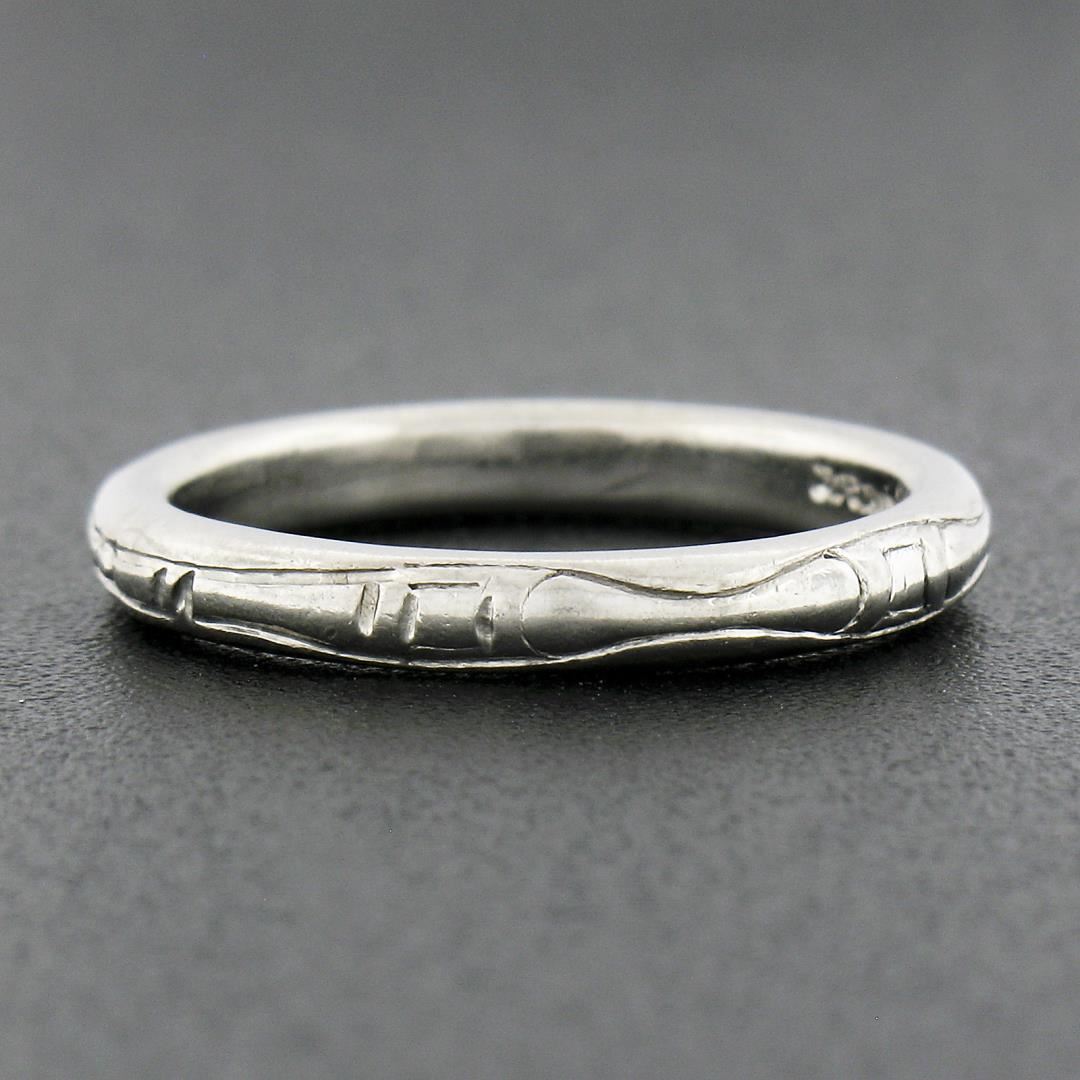 An antique solid platinum band ring by Tiffany & Co. The ring is size 5.0, weighs a total of 4.57 grams, and measures 2.6mm wide.