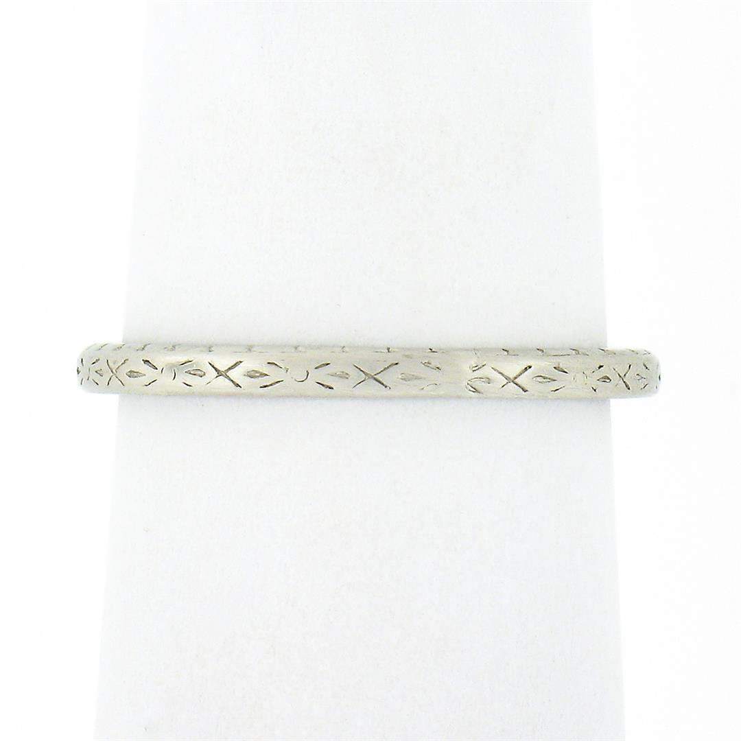 An antique solid platinum engraved eternity band ring by Tiffany & Co. The ring is size 5.0, weighs a total of 2.13 grams, and measures 1.60mm wide
