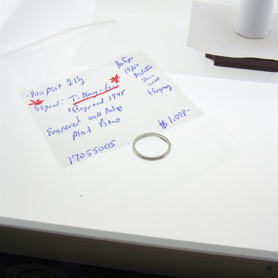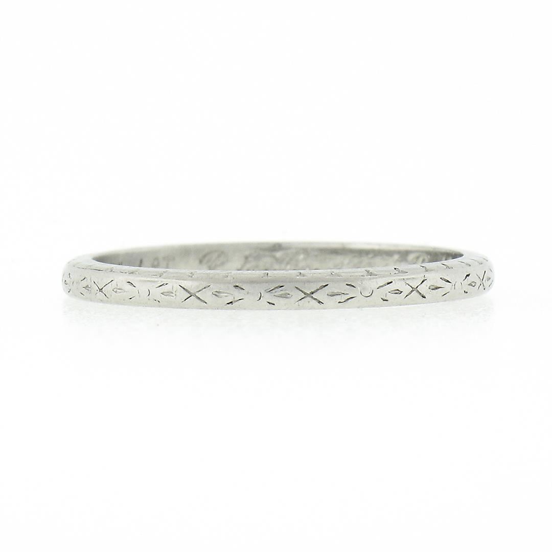 An antique solid platinum engraved eternity band ring by Tiffany & Co. The ring is size 5.0, weighs a total of 2.13 grams, and measures 1.60mm wide