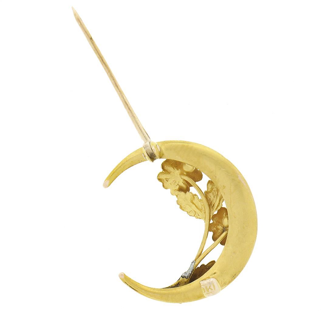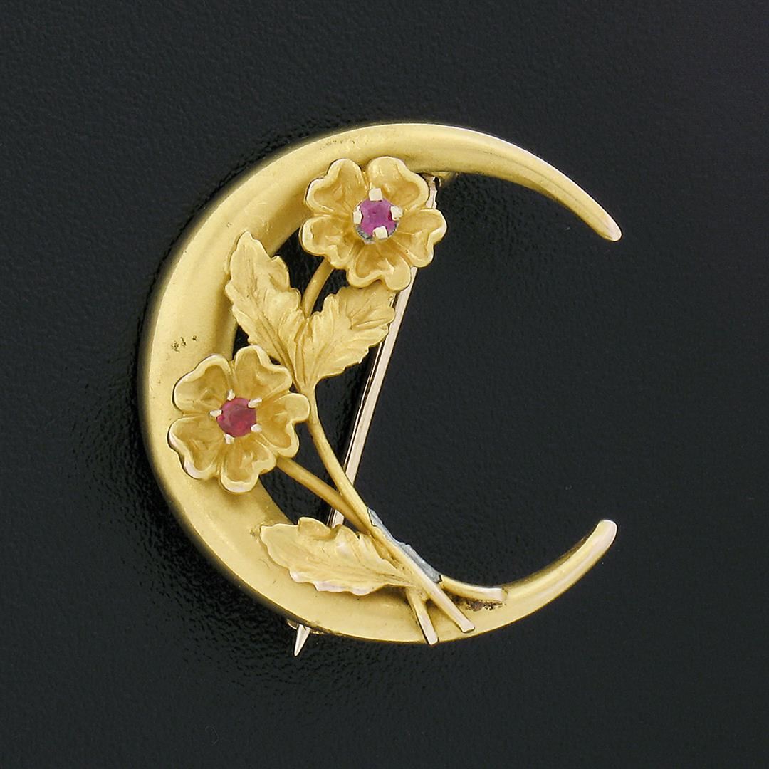 An antique solid 10k yellow gold crescent pin brooch, with 2 round brilliant cut natural rubies (0.04ctw). Measures 20.65x22.70mm and weighs a total of 1.76 grams.