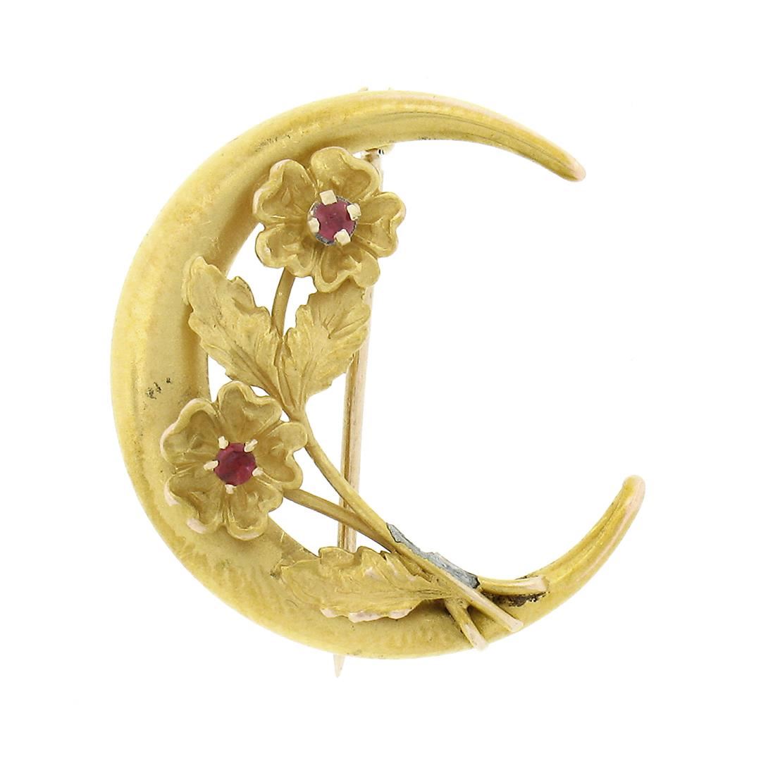 An antique solid 10k yellow gold crescent pin brooch, with 2 round brilliant cut natural rubies (0.04ctw). Measures 20.65x22.70mm and weighs a total of 1.76 grams.