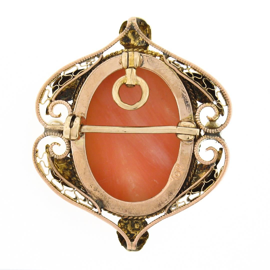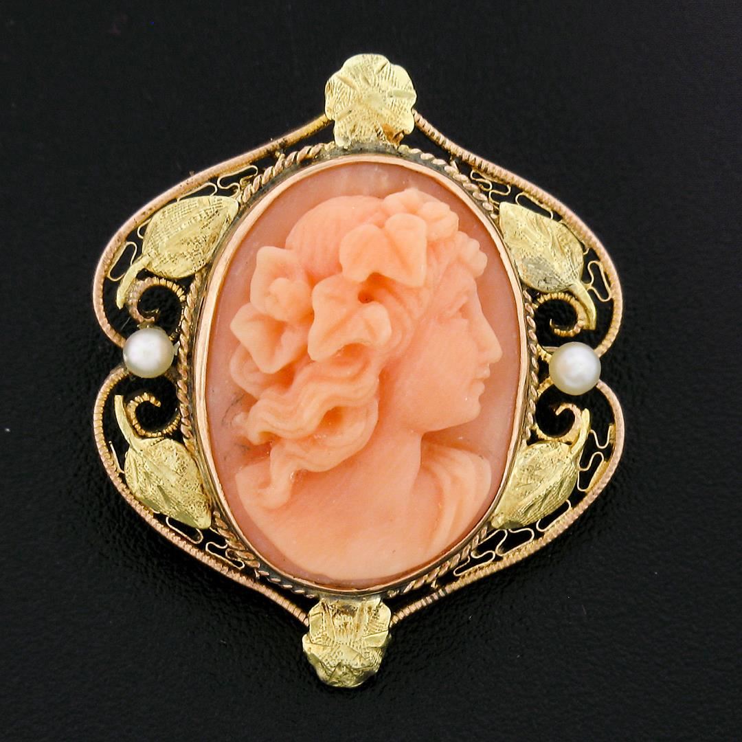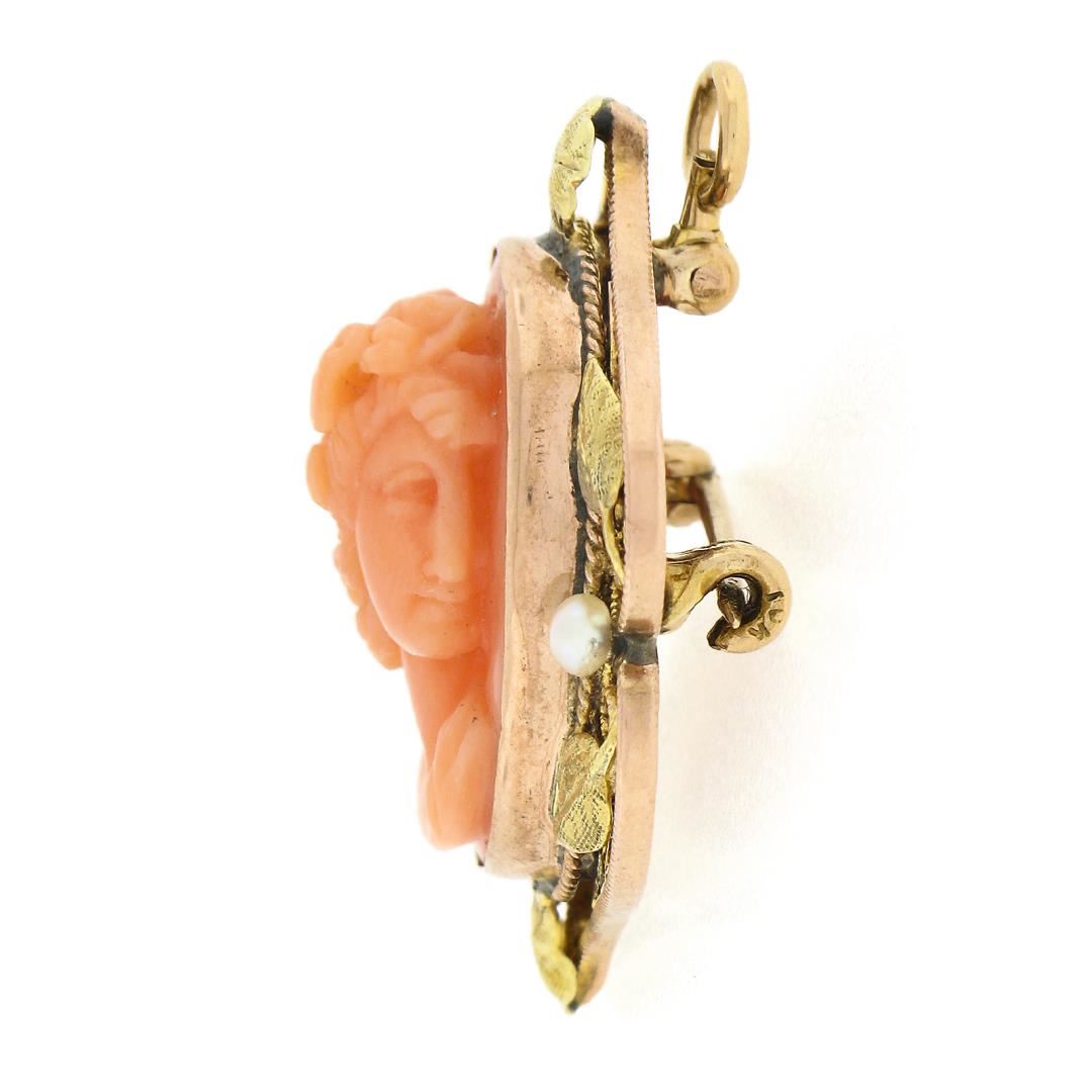 An antique solid 10k yellow gold brooch pendant, with 1 oval shape carved cameo coral (18.5x14.1mm), and 2 round shape cultured seed pearls (2.4mm each ). Measures 28.3x24mm and weighs a total of 5.27 grams.