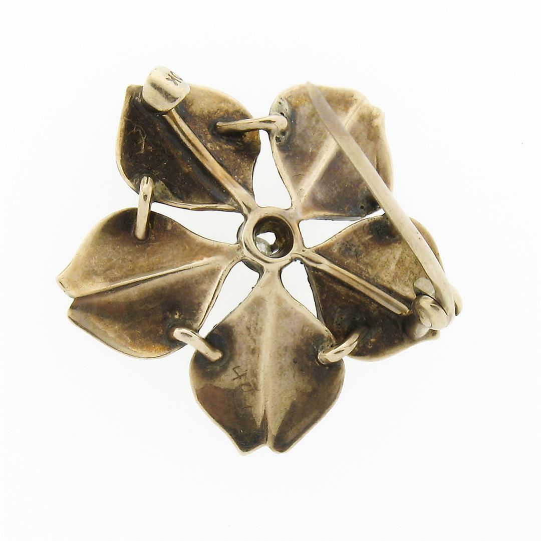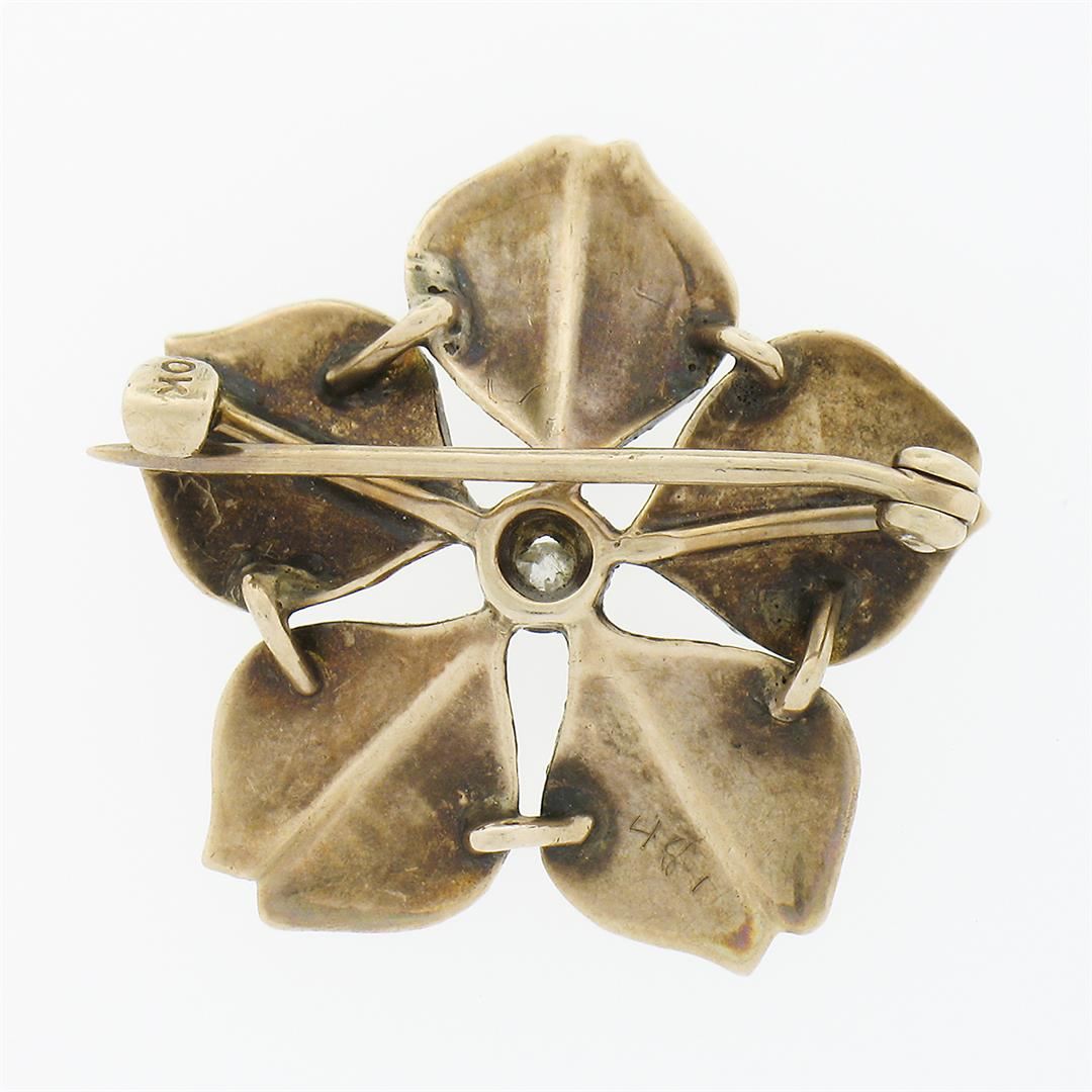 An antique art nouveau flower pin brooch, with enamel work and 1 old european cut natural diamond (VS2 ; H - 0.03ct), with 25 rouns shape cultured seed pearls (1mm to 1.3mm). Measures 21.5x22.9mm and weighs a total of 3.04 grams.