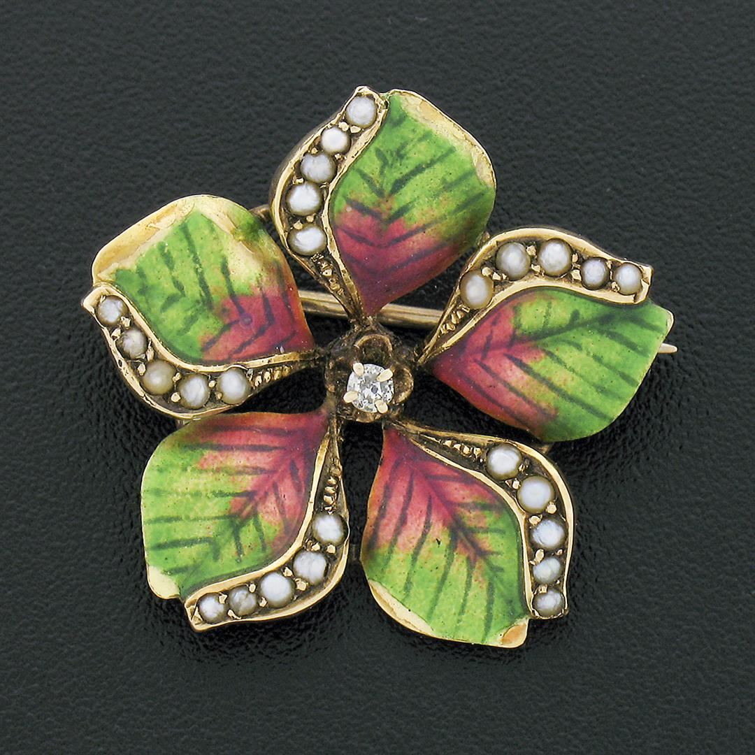 An antique art nouveau flower pin brooch, with enamel work and 1 old european cut natural diamond (VS2 ; H - 0.03ct), with 25 rouns shape cultured seed pearls (1mm to 1.3mm). Measures 21.5x22.9mm and weighs a total of 3.04 grams.