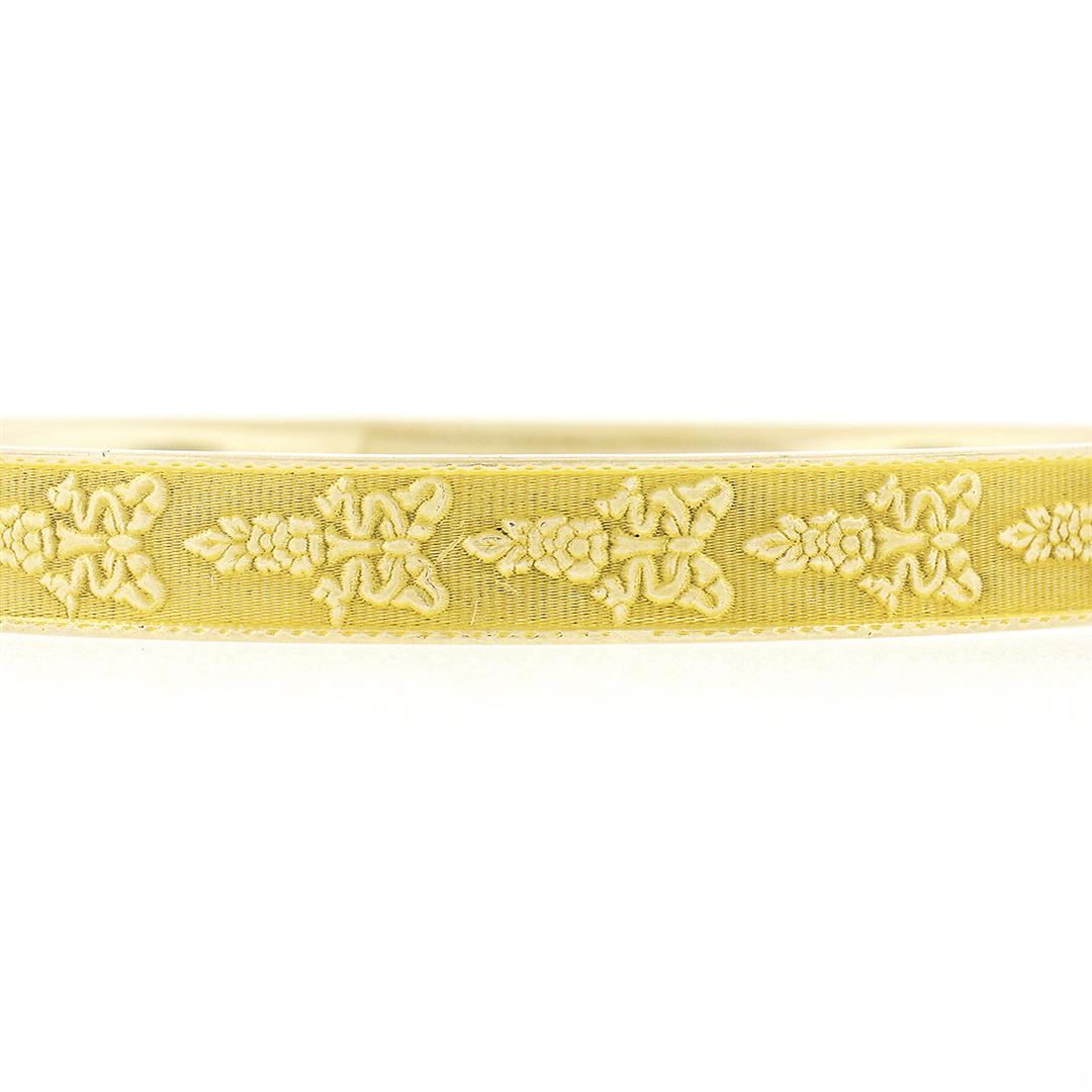 An antique solid 14k yellow gold bangle bracelet. It weighs a total of 12.44 grams, measures 7.7mm wide, and measures 7 inches in length.