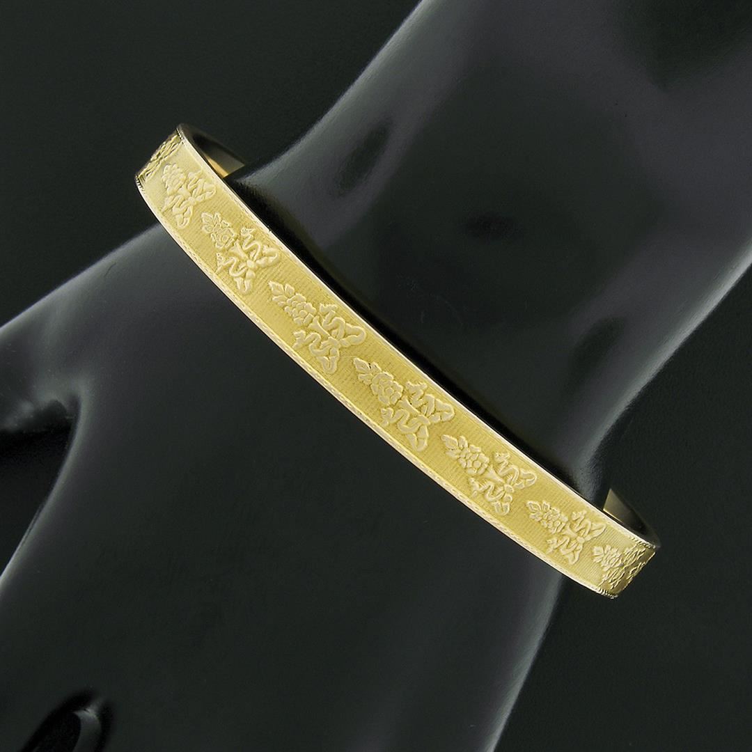 An antique solid 14k yellow gold bangle bracelet. It weighs a total of 12.44 grams, measures 7.7mm wide, and measures 7 inches in length.