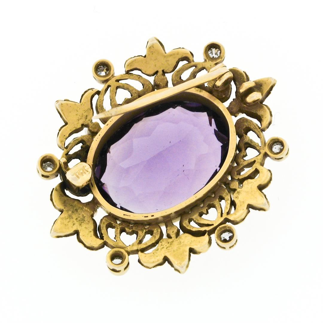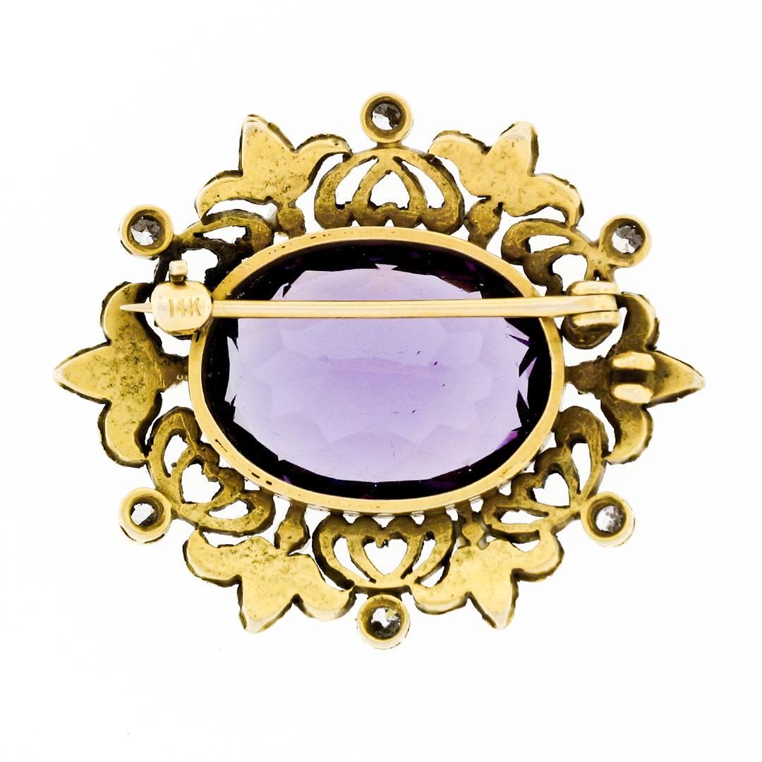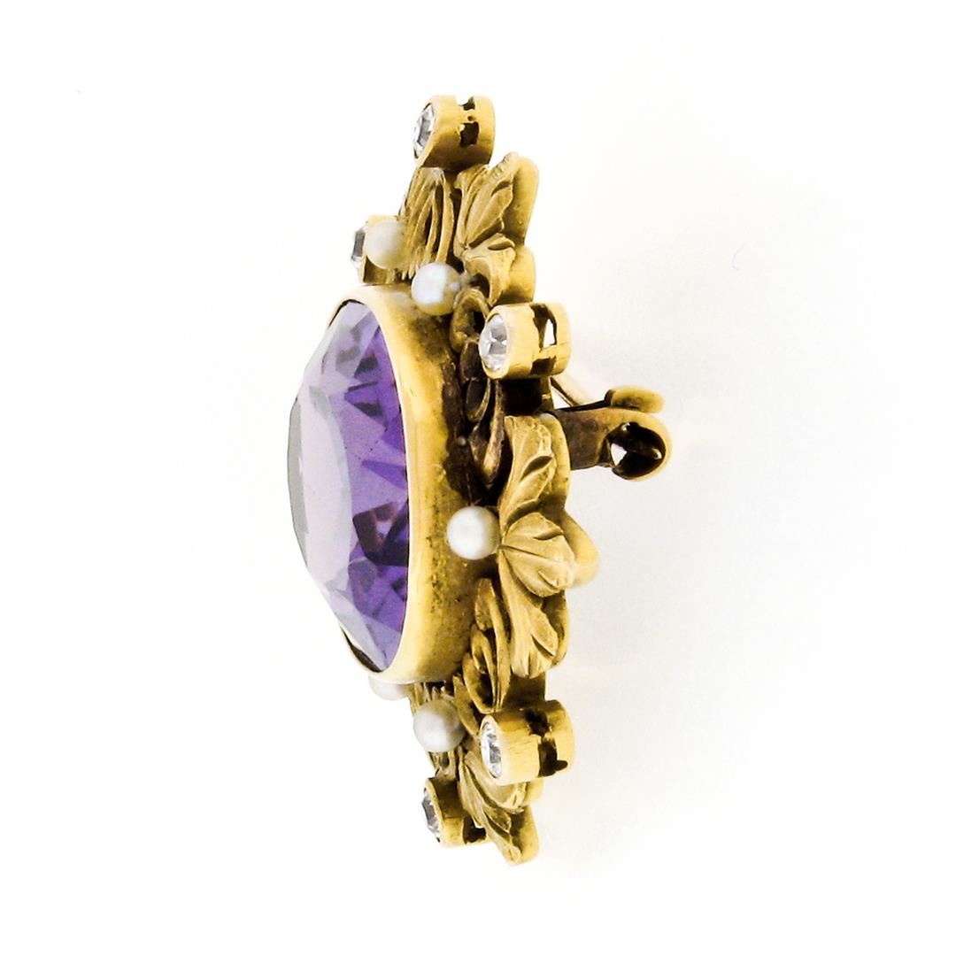 An art nouveau period solid 14k yellow gold brooch with 1 oval cut nautral amethyst (19x14.5mm) surrounded by 6 old European cut natural diamonds (F/G - VS1/VS2; 0.30ctw) and 6 grayish off-white natural seed pearls (2mm). Measures 29.7x34.7mm and weighs a total of 12.73 grams.