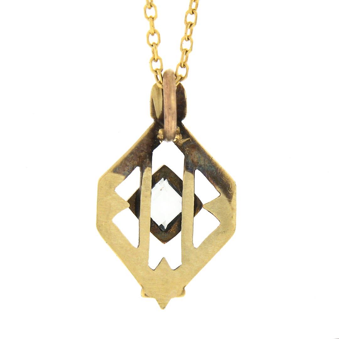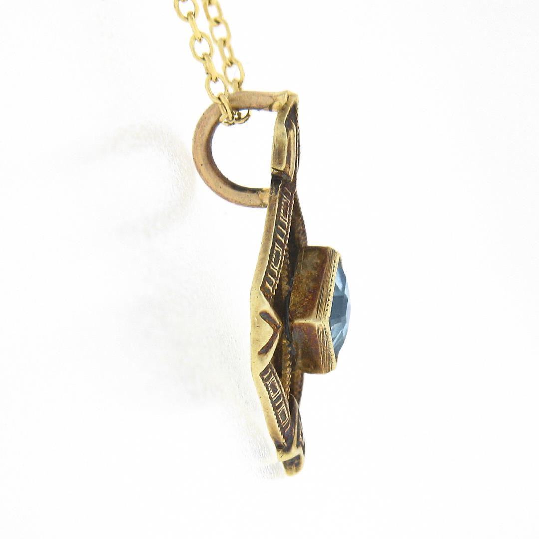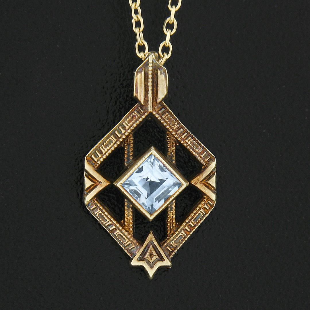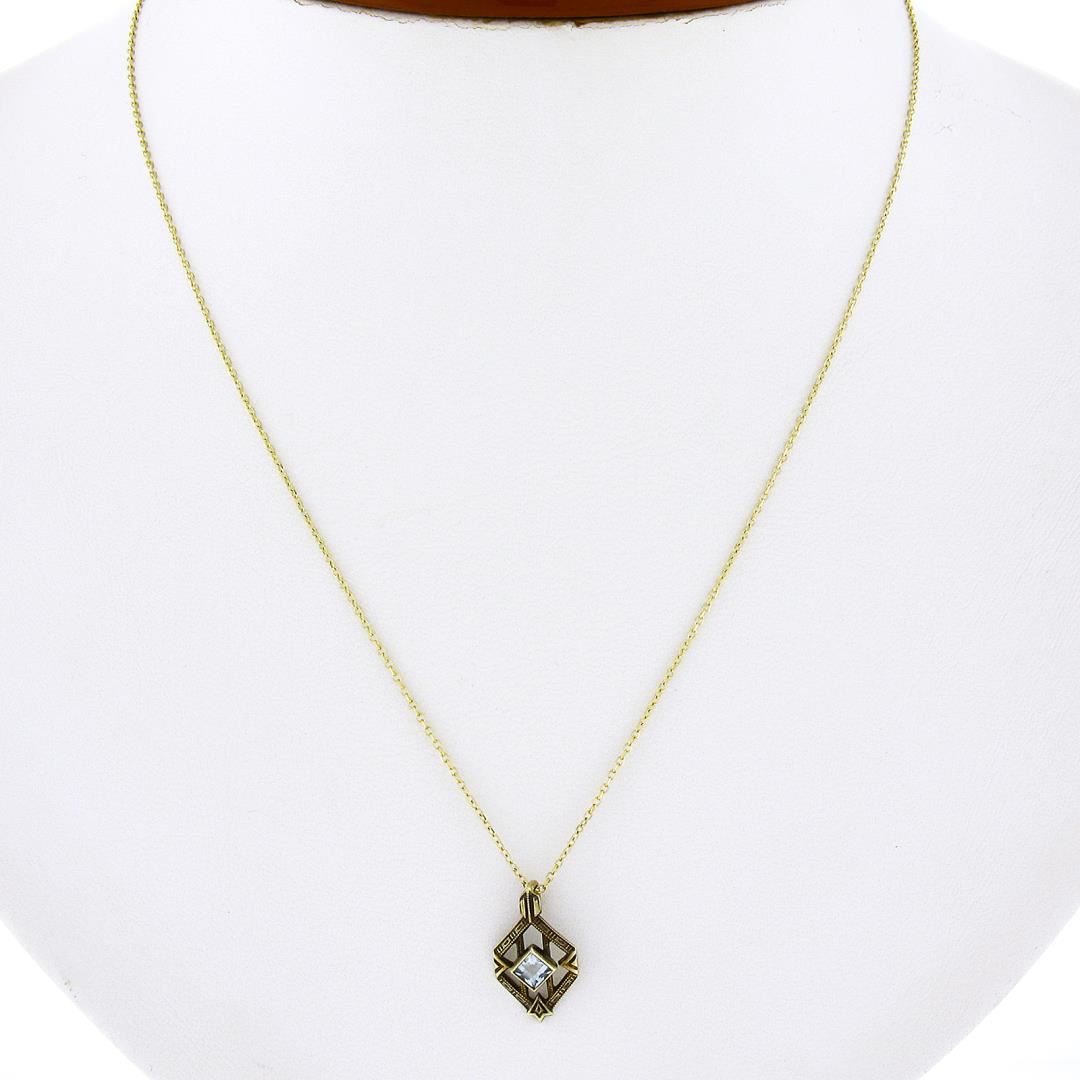 An antique 14k yellow gold pendant necklace, with 1 square step cut natural aquamarine (2.9mm). Adjustable at 16 and 18 inch cable link chain, 1.70 grams total weight, pendant measures 14.90x8.80mm.