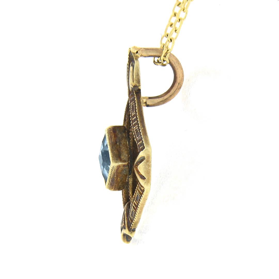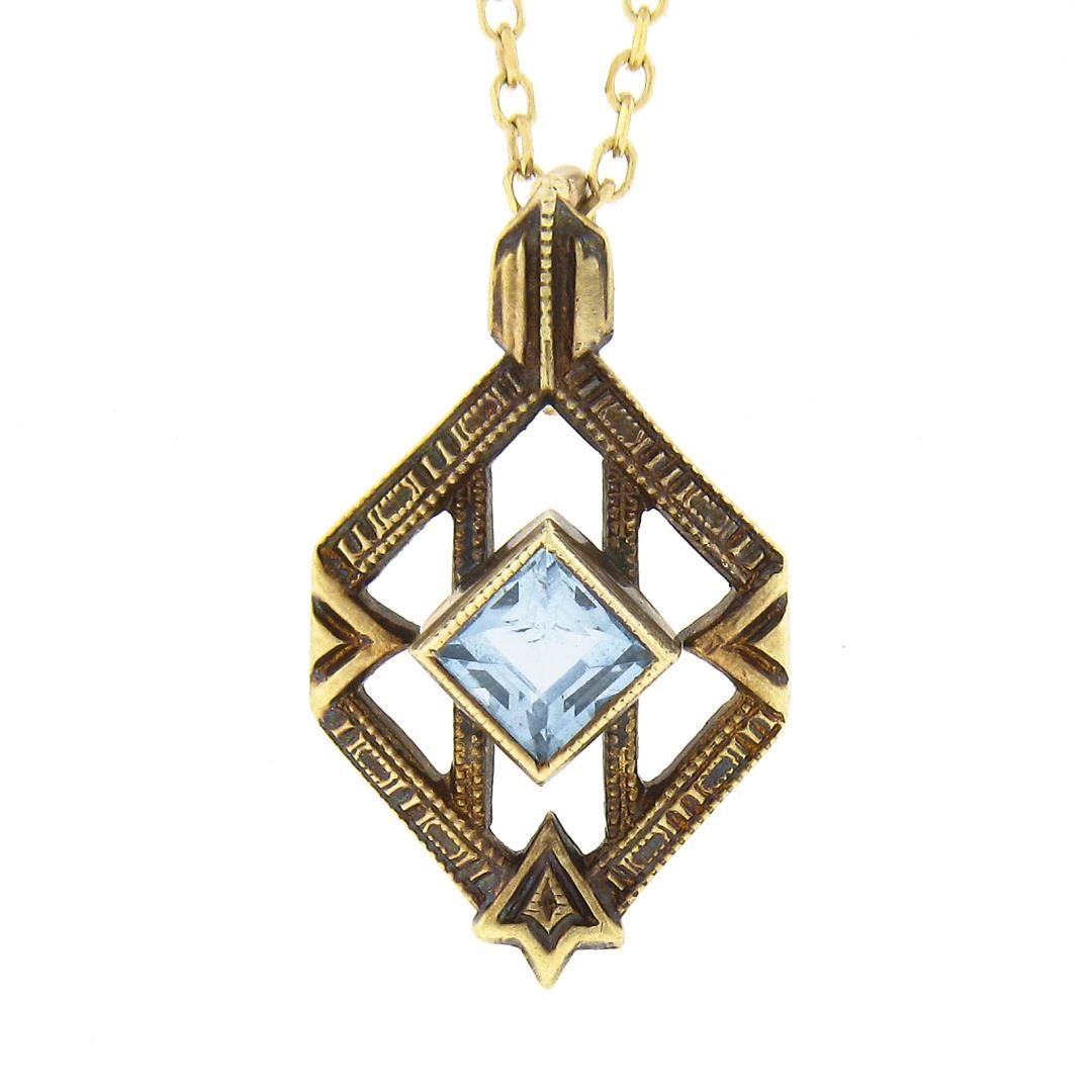An antique 14k yellow gold pendant necklace, with 1 square step cut natural aquamarine (2.9mm). Adjustable at 16 and 18 inch cable link chain, 1.70 grams total weight, pendant measures 14.90x8.80mm.