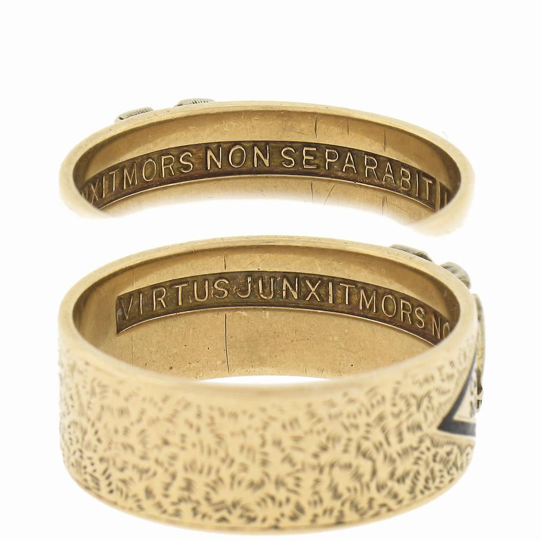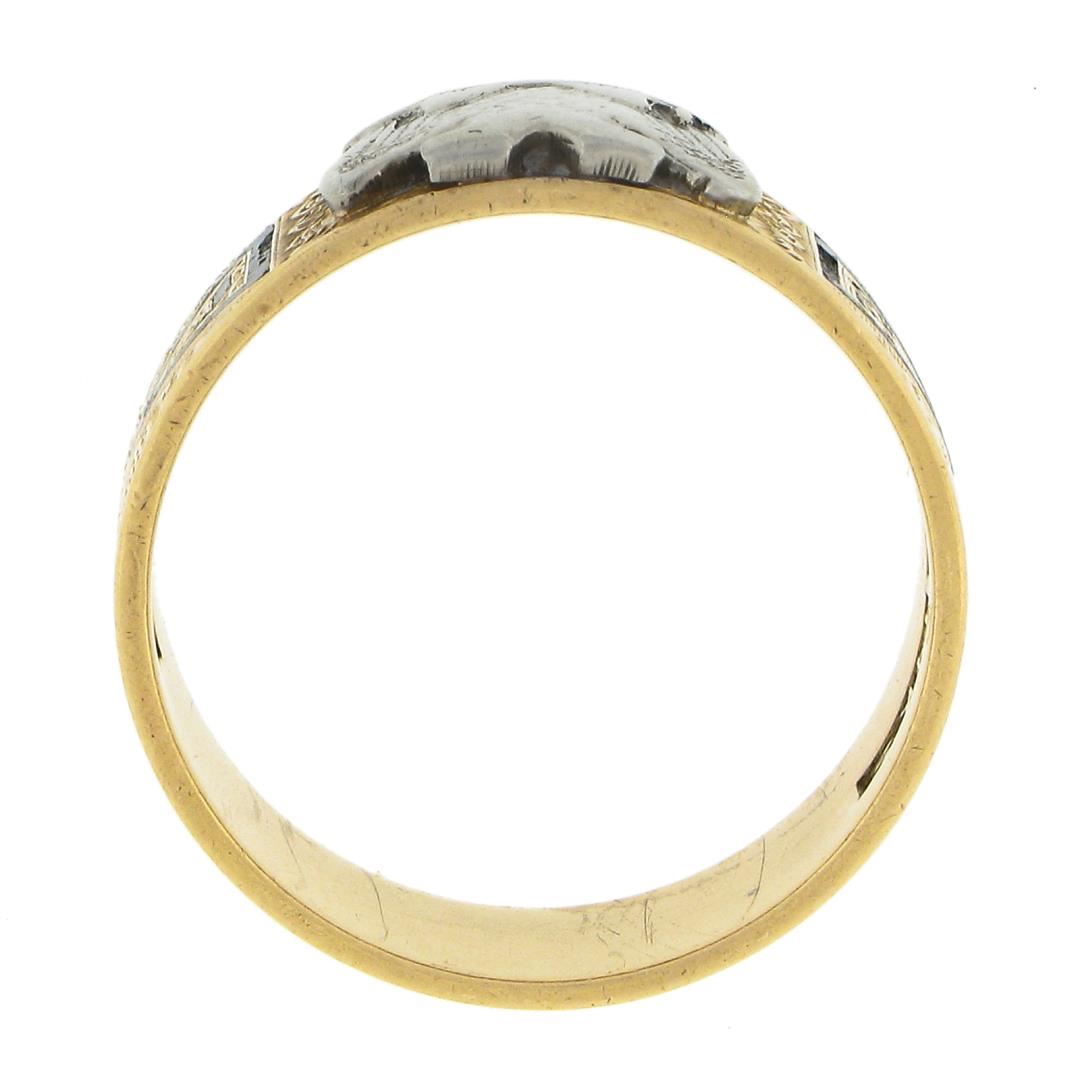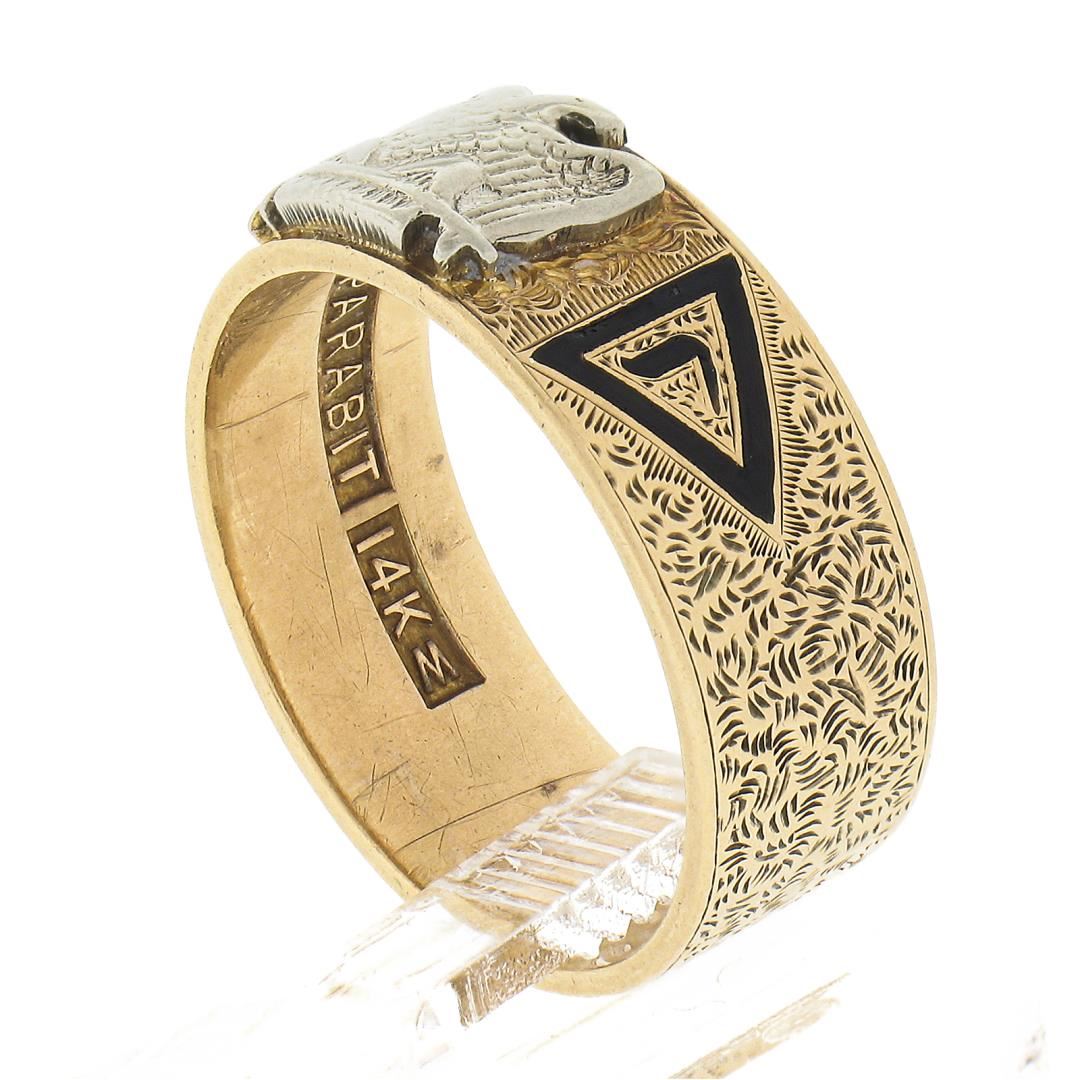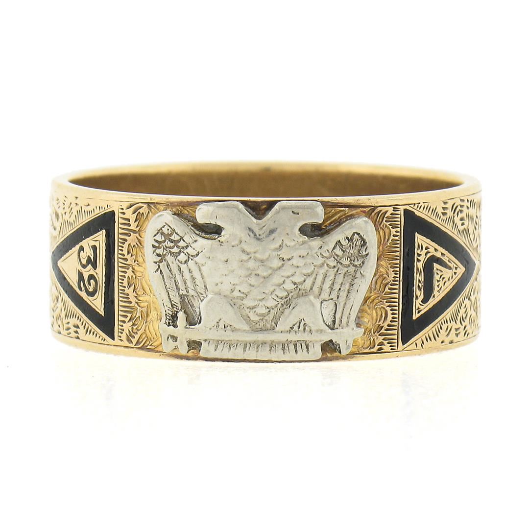 An antique solid 14k yellow gold and black enamel work band ring. The ring is size 9.5, weighs a total of 6.63 grams, and measures 7.8mm wide.