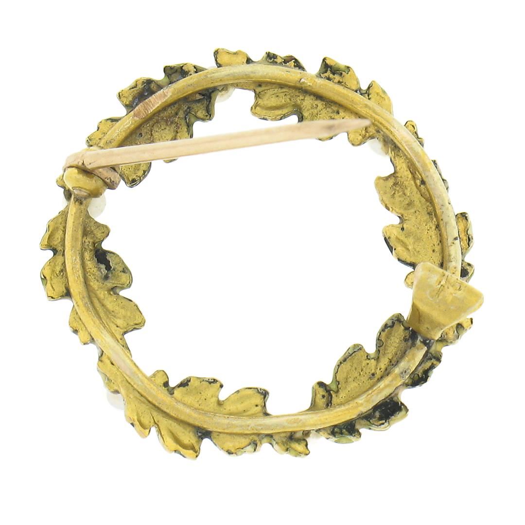 An antique solid 14k yellow gold & green enamel work wreath brooch, with 6 round shape cultured seed pearls (2.0-2.3mm each). Measures 23.6mm in diameter and weighs a total of 2.81 grams.