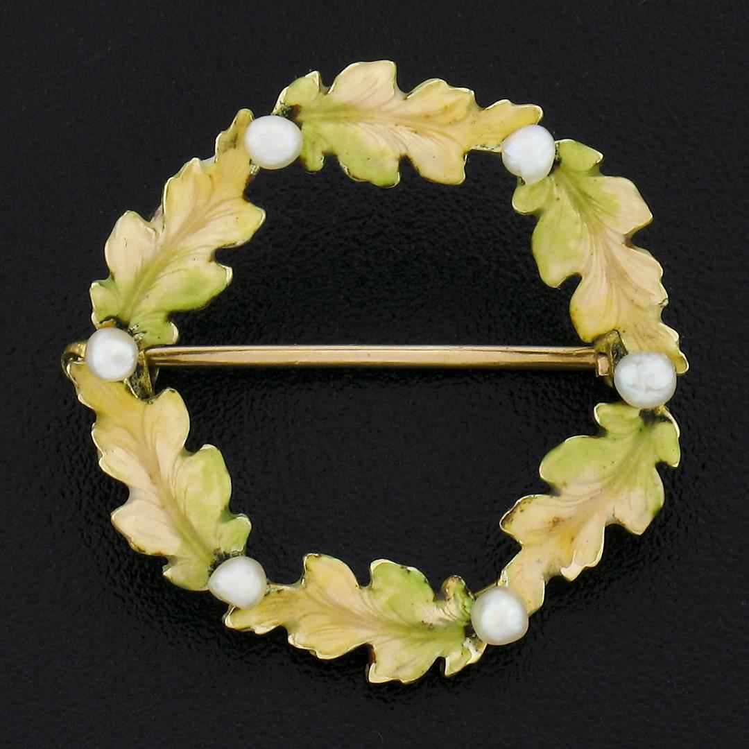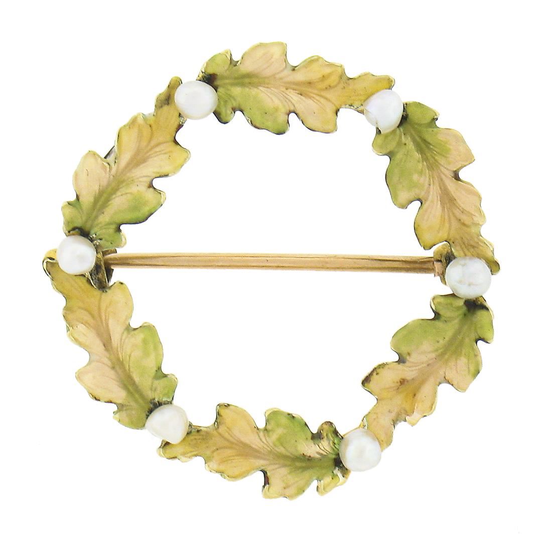 An antique solid 14k yellow gold & green enamel work wreath brooch, with 6 round shape cultured seed pearls (2.0-2.3mm each). Measures 23.6mm in diameter and weighs a total of 2.81 grams.