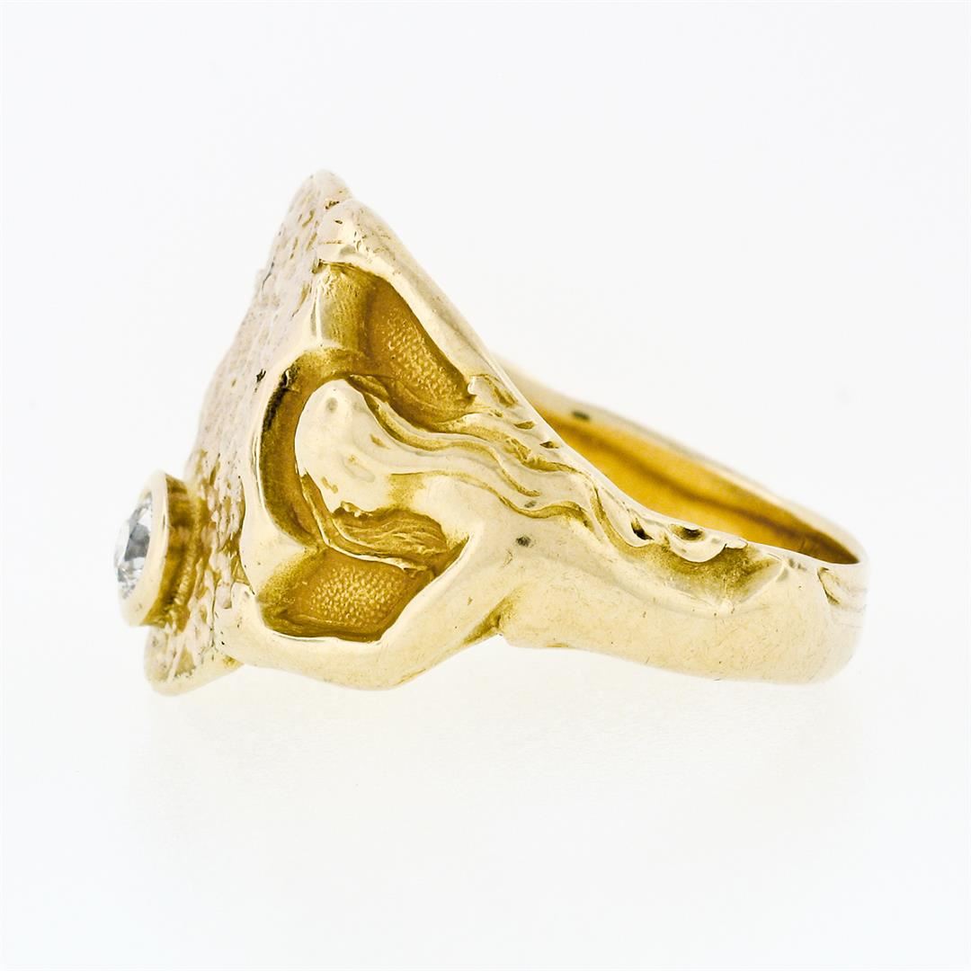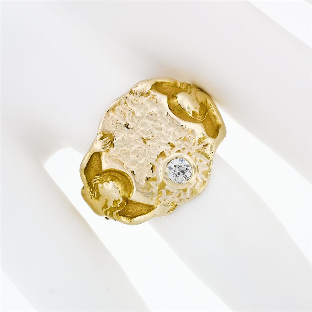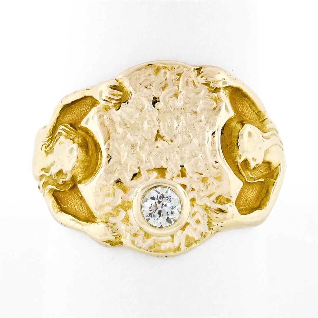 An antique solid 14k yellow gold portrait ring by JR Wood & Son, with 1 old european cut natural diamond (F - VS1 ; 0.20ct ). The ring is size 9.5, weighs a total of 9.48 grams, and measures 17.5mm wide.