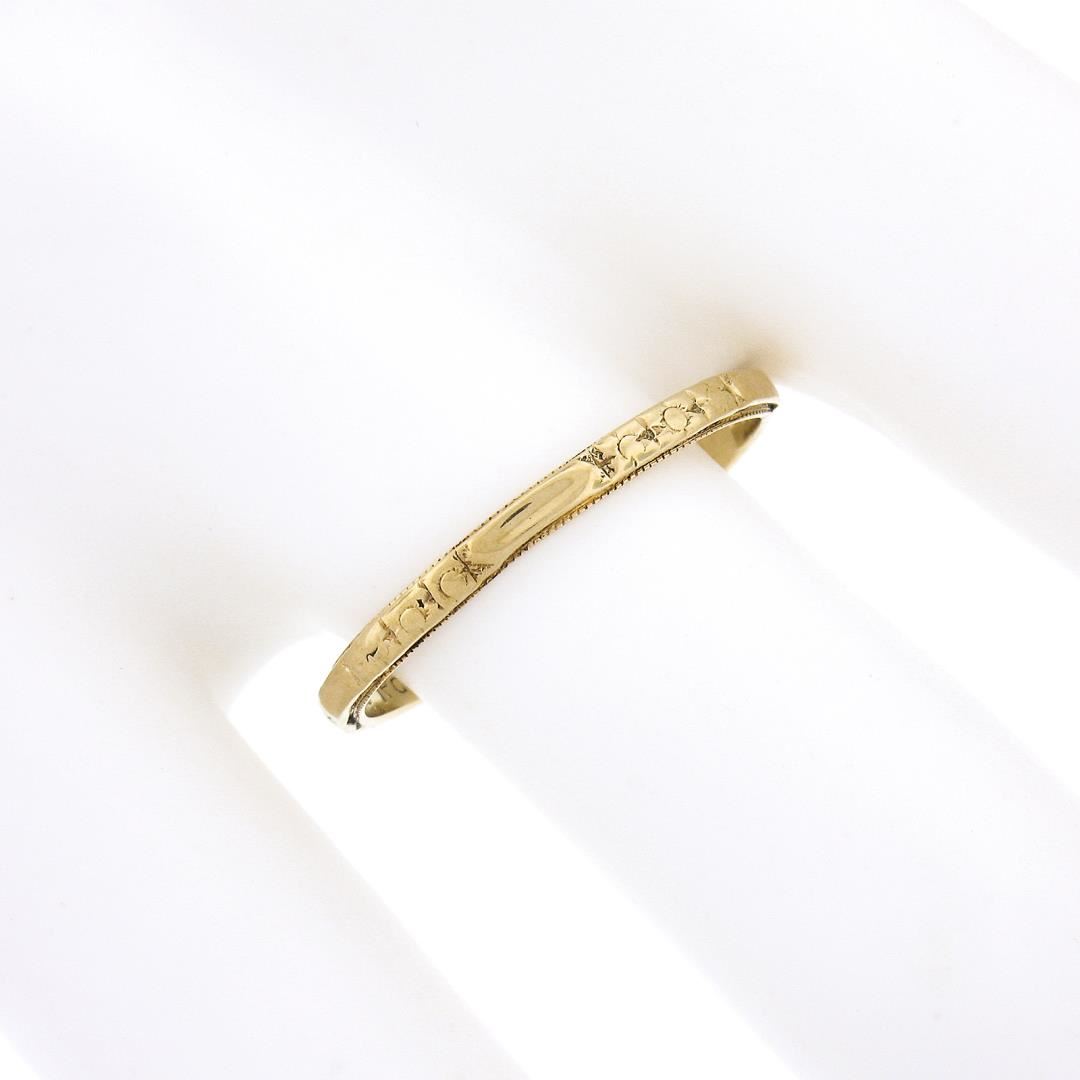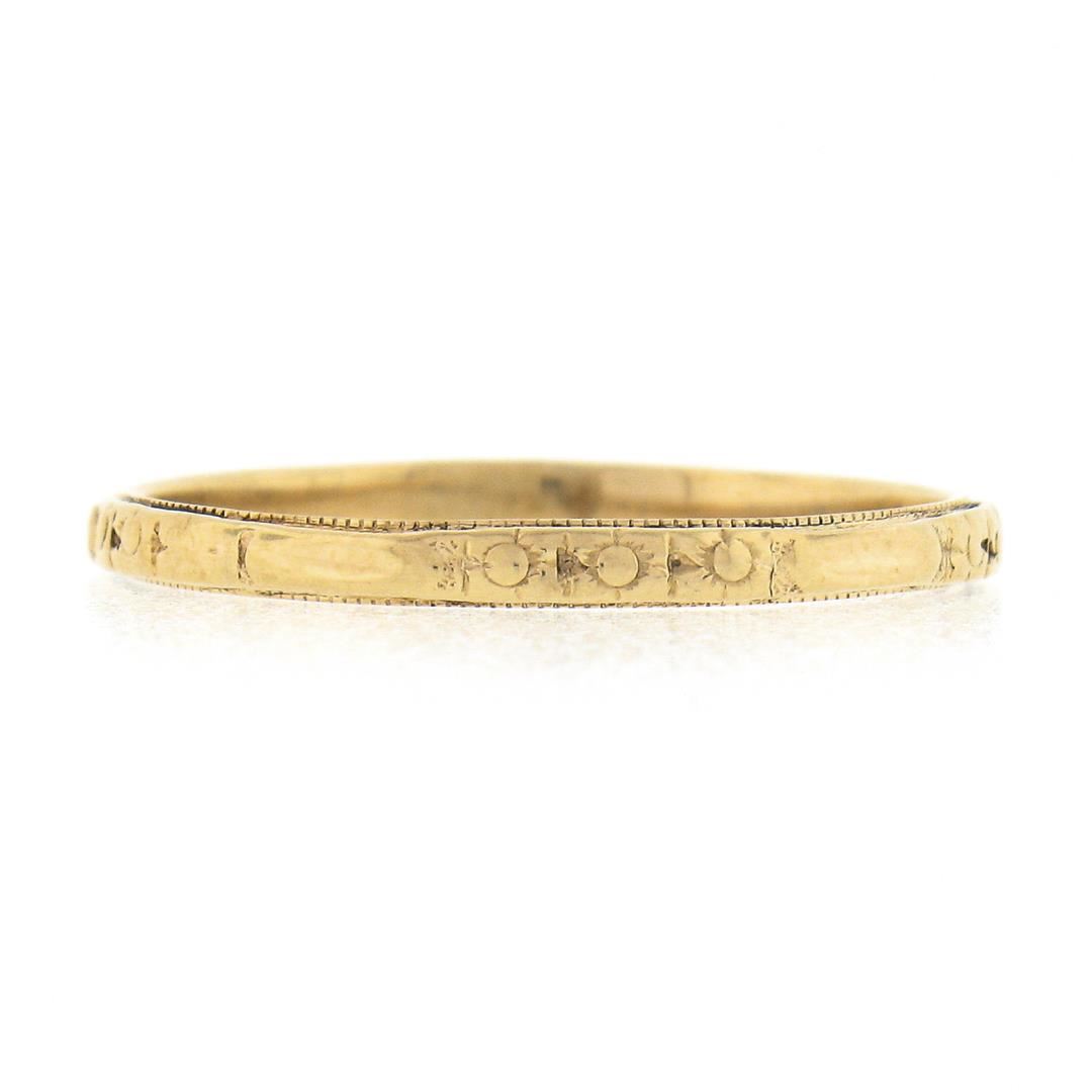 An antique solid 14k yellow gold band ring. The ring is size 7.5, weighs a total of 1.50 grams, and measures 1.9mm wide.
