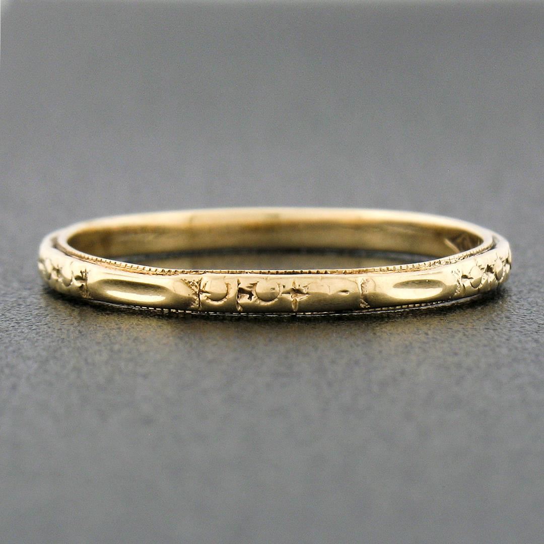 An antique solid 14k yellow gold band ring. The ring is size 7.5, weighs a total of 1.50 grams, and measures 1.9mm wide.