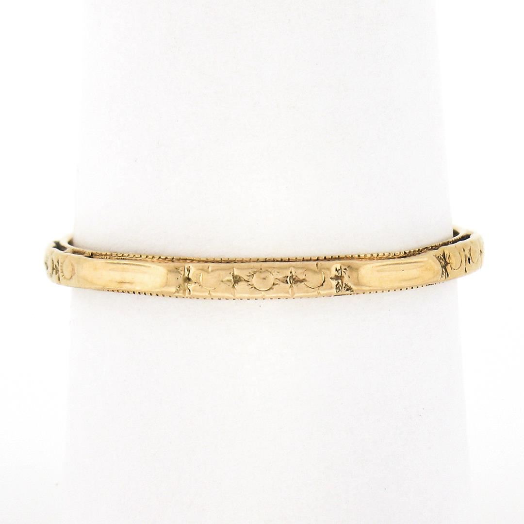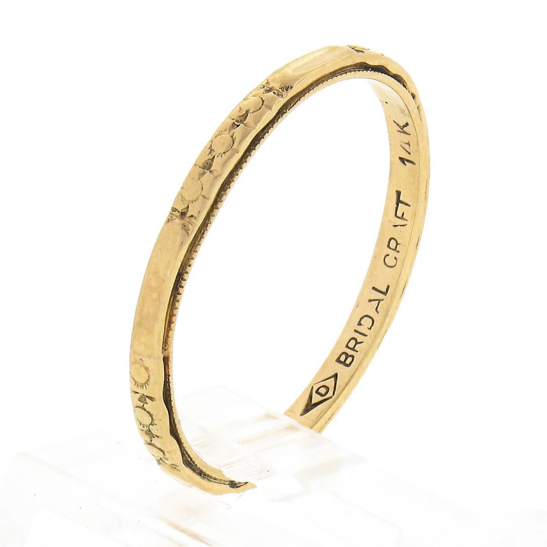 An antique solid 14k yellow gold band ring. The ring is size 7.5, weighs a total of 1.50 grams, and measures 1.9mm wide.