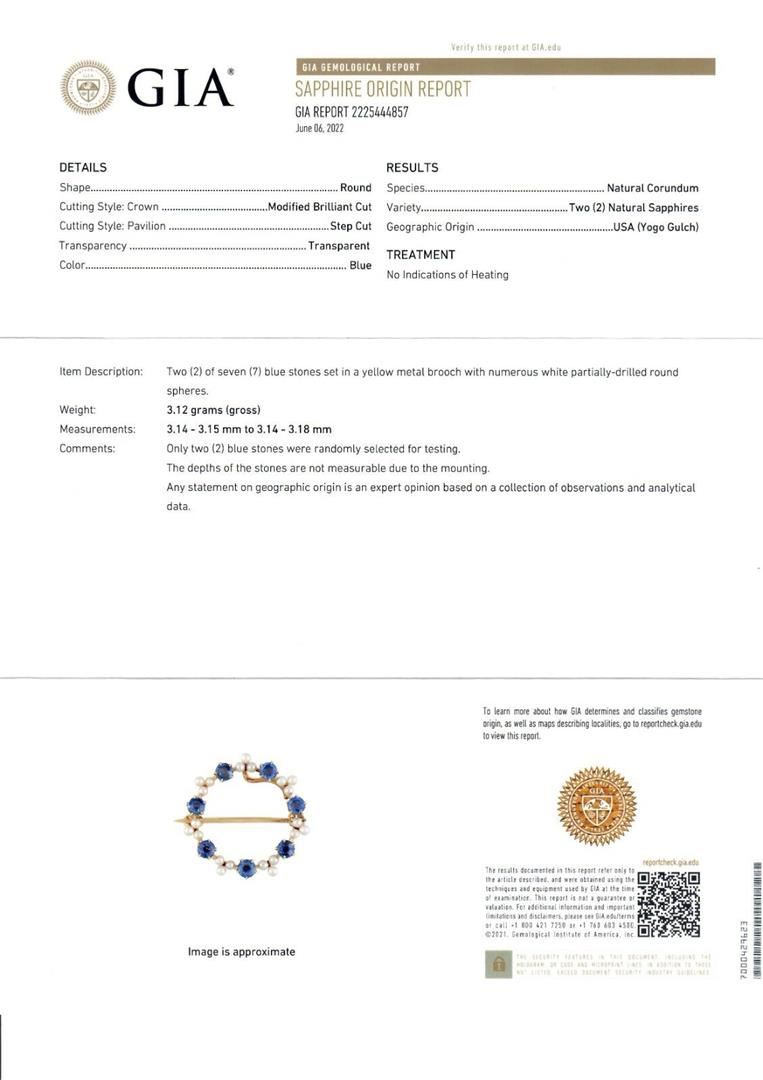An antique solid 14k yellow gold wreath pin brooch, with 7 Gia certified round cut natural sapphires (1.19ctw), and 21 round shape cultured pearls (1.85mm). Measures 23.04x23.13mm and weighs a total of 3.13 grams. Comes with all original relevant certifications.