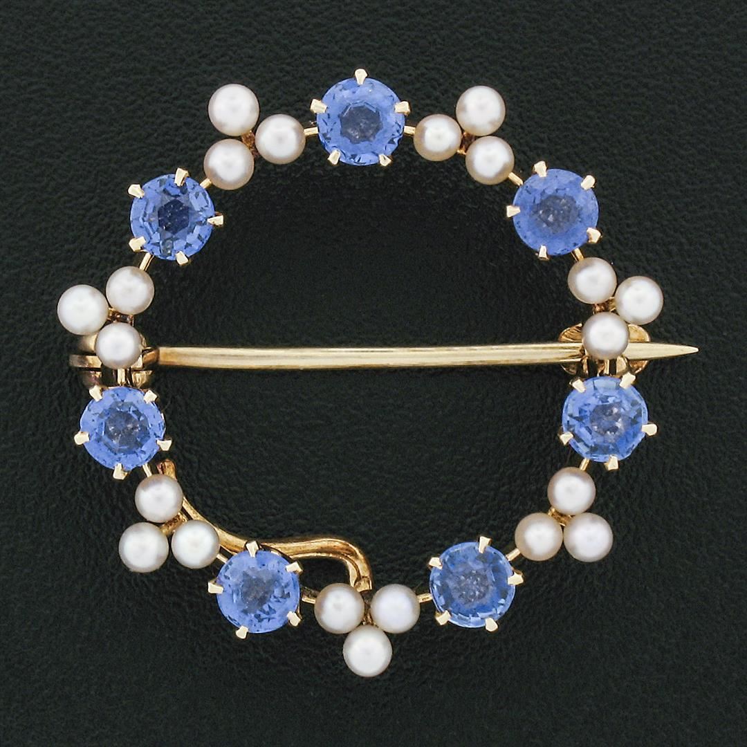 An antique solid 14k yellow gold wreath pin brooch, with 7 Gia certified round cut natural sapphires (1.19ctw), and 21 round shape cultured pearls (1.85mm). Measures 23.04x23.13mm and weighs a total of 3.13 grams. Comes with all original relevant certifications.
