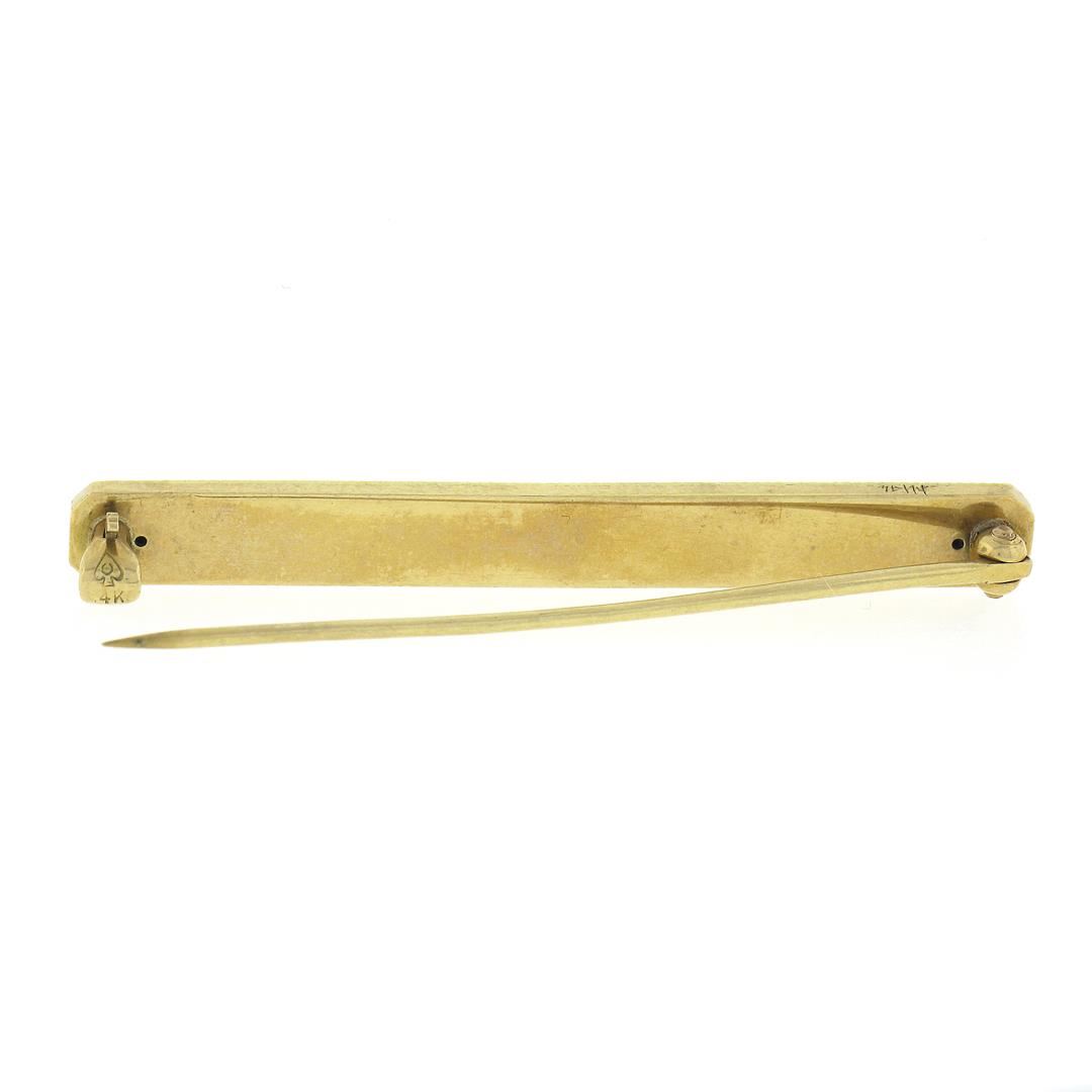An antique solid 14k yellow gold & enamel work bar brooch, with 1 round shape cultured seed pearl (2.3mm ). Measures 5x45.5mm and weighs a total of 2.85 grams.