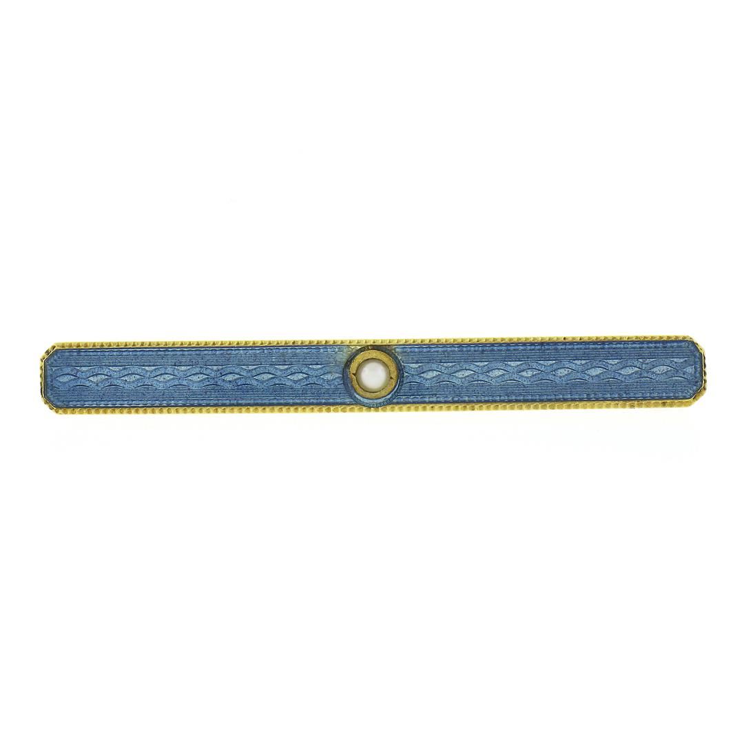 An antique solid 14k yellow gold & enamel work bar brooch, with 1 round shape cultured seed pearl (2.3mm ). Measures 5x45.5mm and weighs a total of 2.85 grams.
