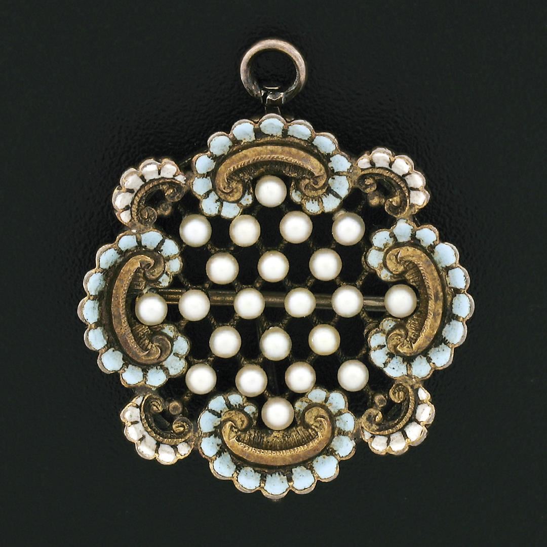 An antique solid 14k yellow gold brooch pendant. with blue and white enamel worl & 22 round shape natural seed pearls (2.10). Measures 25.30x25.50mm and weighs a total of 5.46 grams.