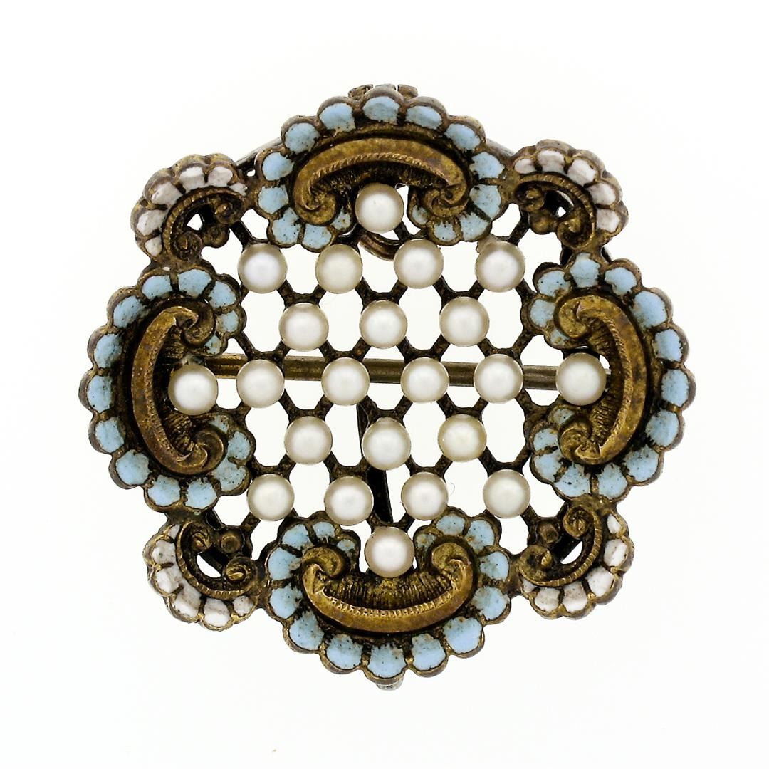 An antique solid 14k yellow gold brooch pendant. with blue and white enamel worl & 22 round shape natural seed pearls (2.10). Measures 25.30x25.50mm and weighs a total of 5.46 grams.
