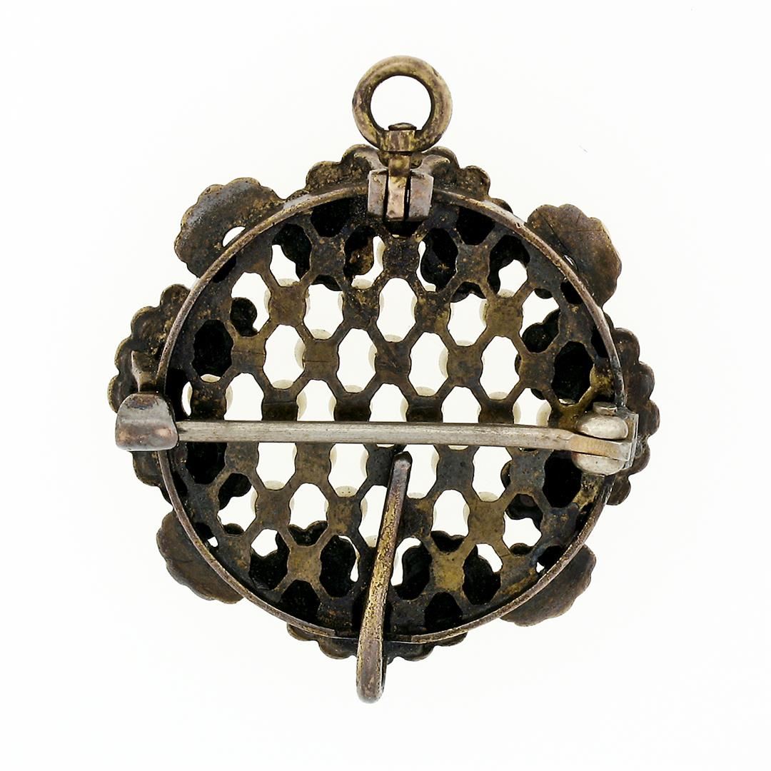 An antique solid 14k yellow gold brooch pendant. with blue and white enamel worl & 22 round shape natural seed pearls (2.10). Measures 25.30x25.50mm and weighs a total of 5.46 grams.