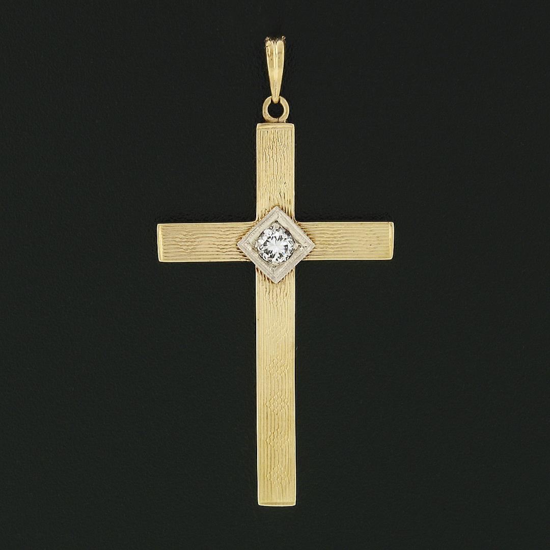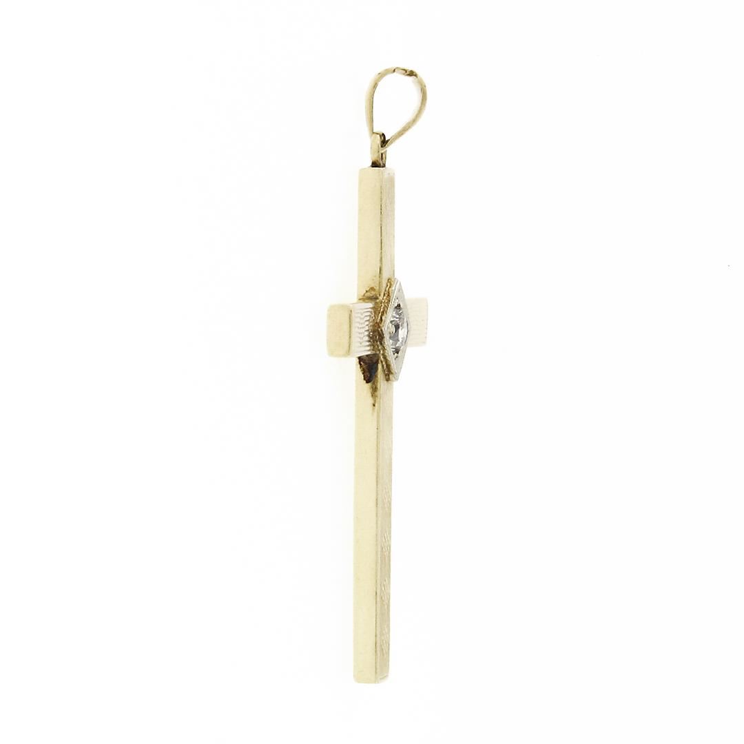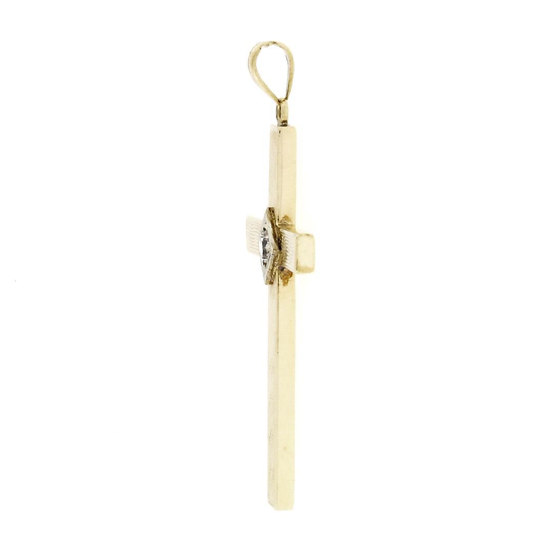 An antique art nouveau solid 14k yellow & white gold cross pendant, with 1 old transitional cut natural diamond (H - VS2 ; 0.16ct). The pendant weighs a total of 1.9 grams, measures 45.75x23mm including the bail, and the inside of the bail measures 4.9x3.25mm.