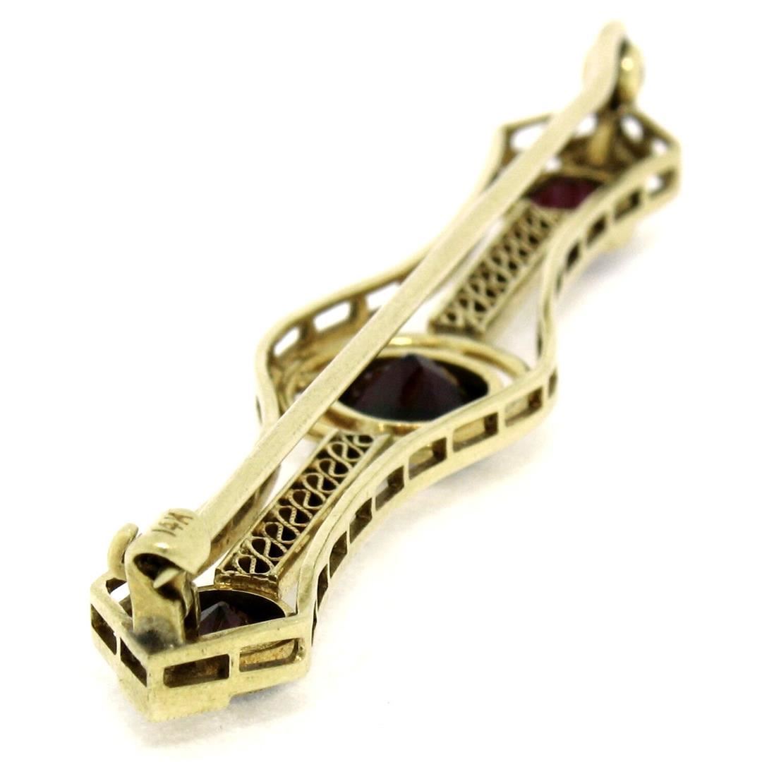 An antique art nouveau solid 14k yellow gold bar pin brooch, with 3 old round cut natural garnets (2.20ctw). Measures 12.22x58.70mm and weighs a total of 5.36 grams.