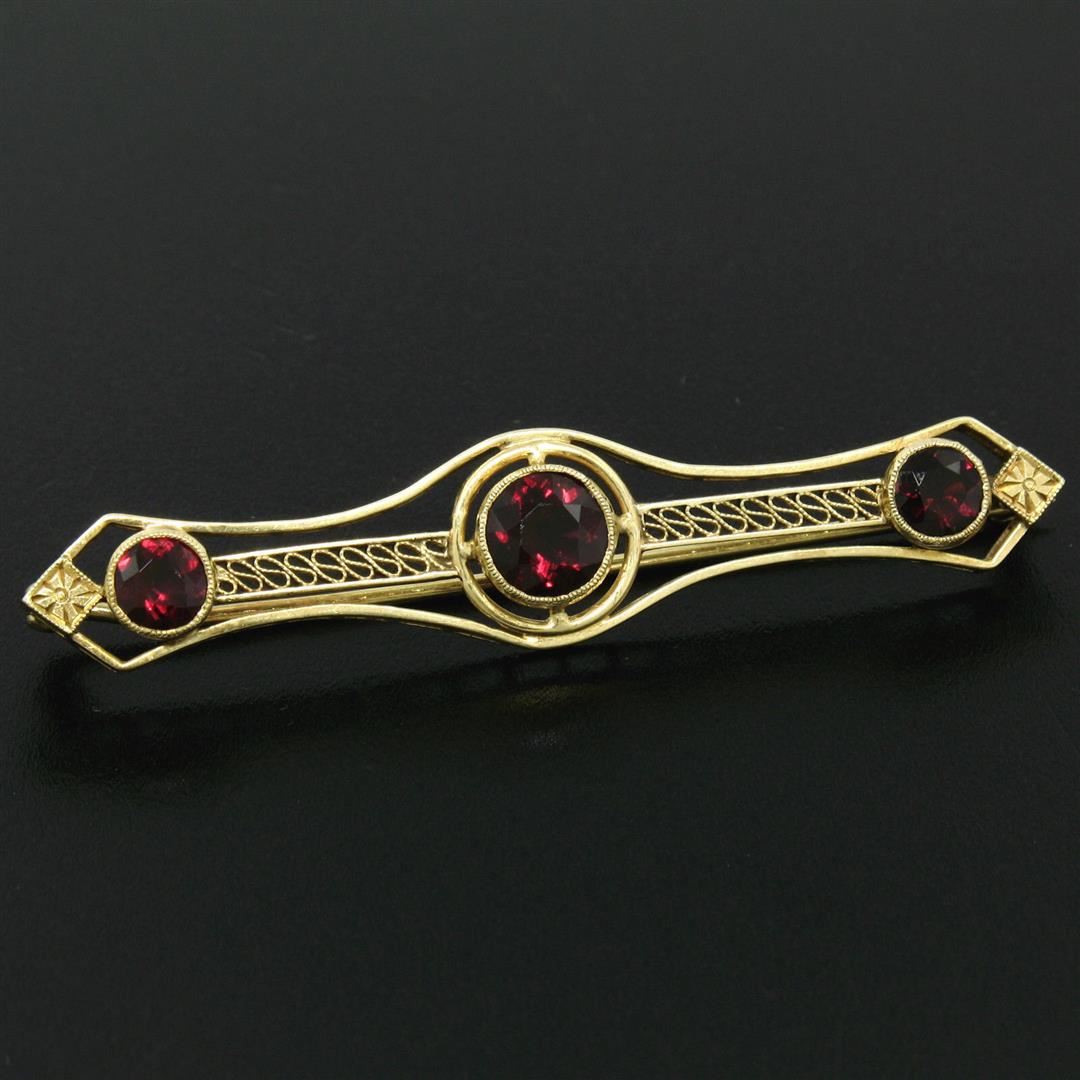 An antique art nouveau solid 14k yellow gold bar pin brooch, with 3 old round cut natural garnets (2.20ctw). Measures 12.22x58.70mm and weighs a total of 5.36 grams.