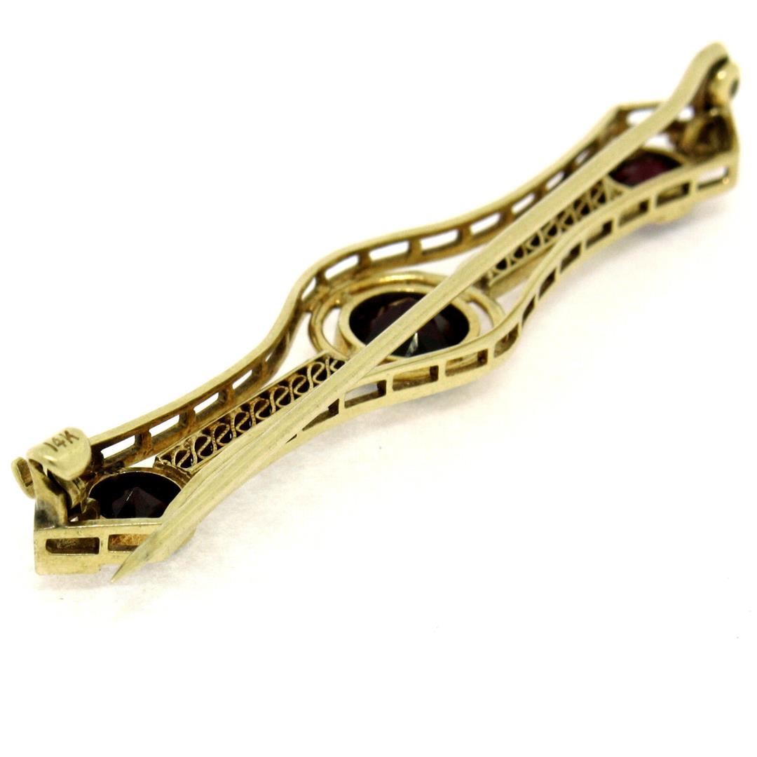 An antique art nouveau solid 14k yellow gold bar pin brooch, with 3 old round cut natural garnets (2.20ctw). Measures 12.22x58.70mm and weighs a total of 5.36 grams.