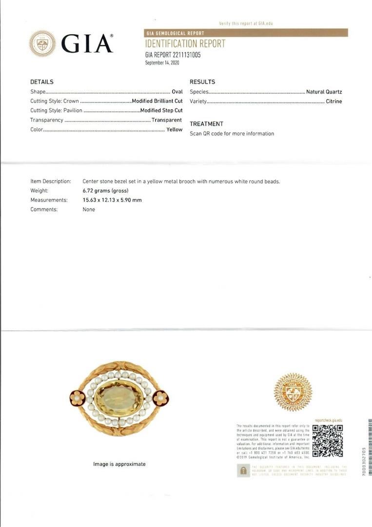 An antique solid 14k yellow gold pin brooch, wirh 1 Gia certified oval step cut natural citrine (5.93ct ), and 25 natural cultured pearls (2.0mm to 2.5mm). Measures 25.7x33.8mm and weighs a total of 6.72 grams. Comes with all original relevant certifications.